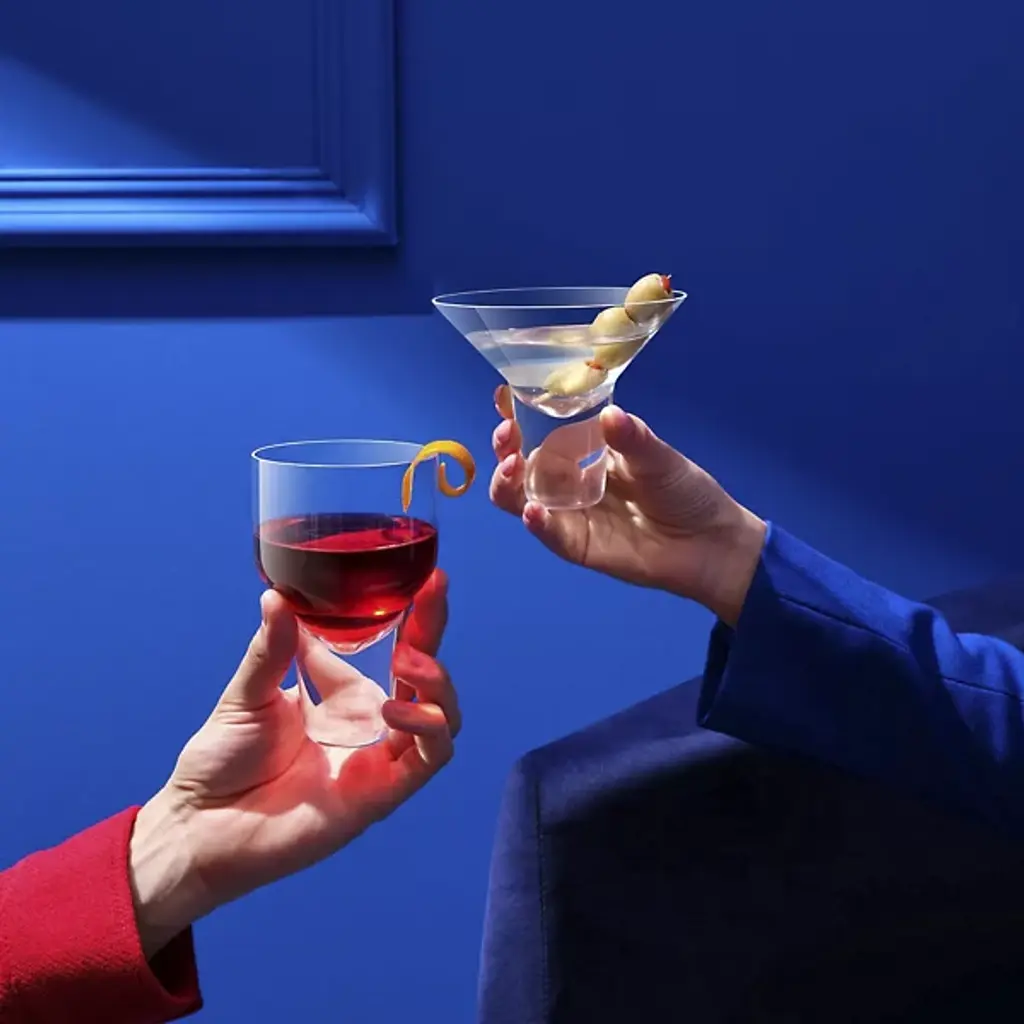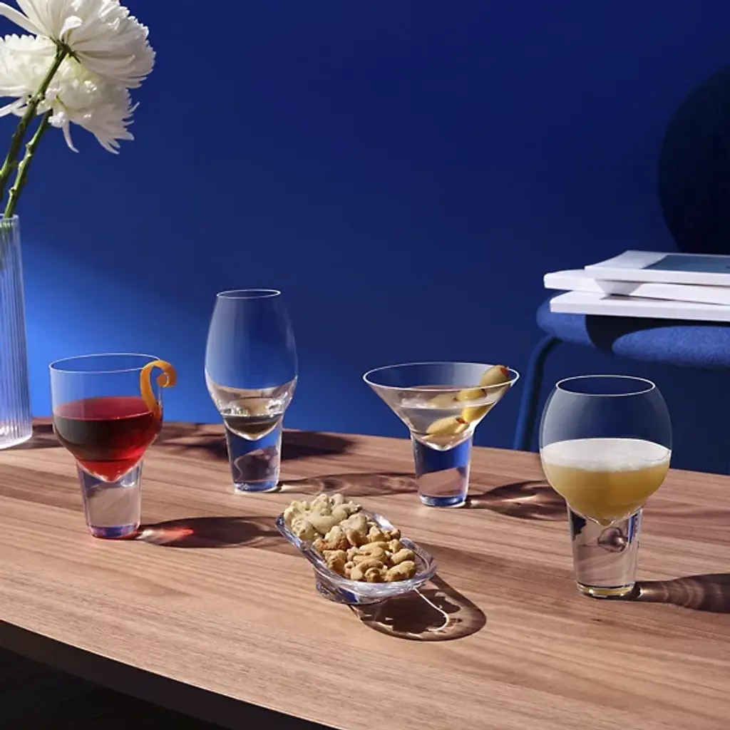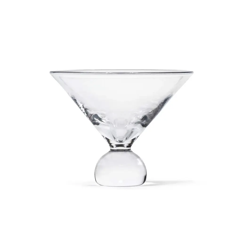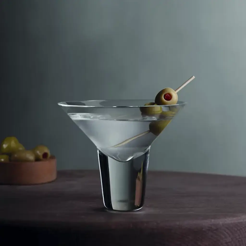 The Gravity Martini Cocktail Glass, Set of 2 from Nude displays a wide conical bowl that tapers sharply into a thick crystal stem. Designed by Ali Bakova and crafted in Turkey from lead-free crystal, the glass features clean geometric lines with a substantial base that provides stability. Its broad rim accommodates garnishes while the angular profile maintains the Gravity collection's architectural aesthetic.