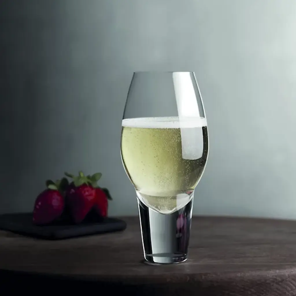 The Gravity Tall Cocktail Glass, Set of 2 from Nude extends upward through an oval bowl that tapers to meet a solid crystal stem. Created by Ali Bakova in Turkey from lead-free crystal, the vessel’s elongated form accommodates larger servings while the weighted base provides balance. The neck's gentle curve distinguishes the bowl from the substantial foundation below.