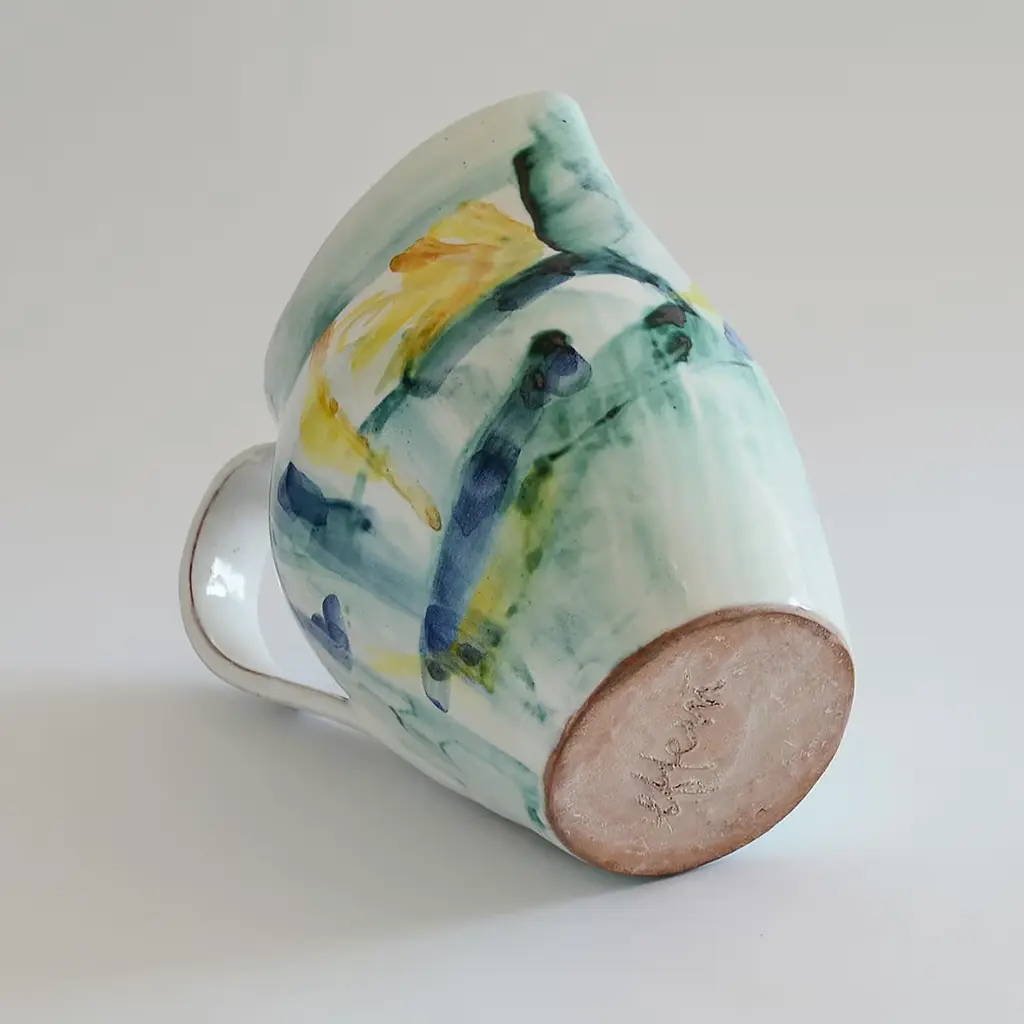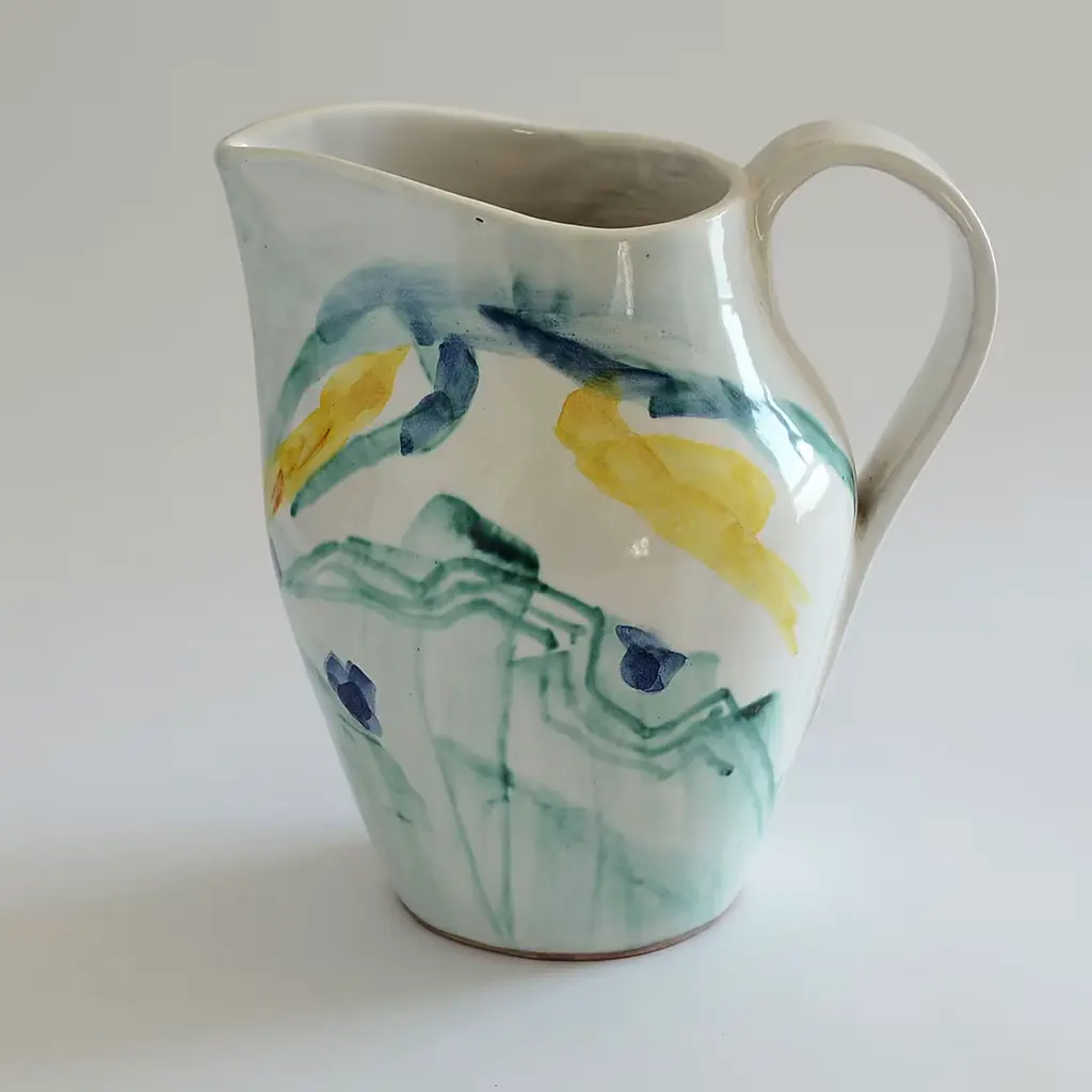 This exquisite ceramic jug was hand made on a lathe and then glazed with a dynamic brush stroke pattern in vivid green. Due to its hand-crafted nature, reproductions of this piece will be similar but not identical.