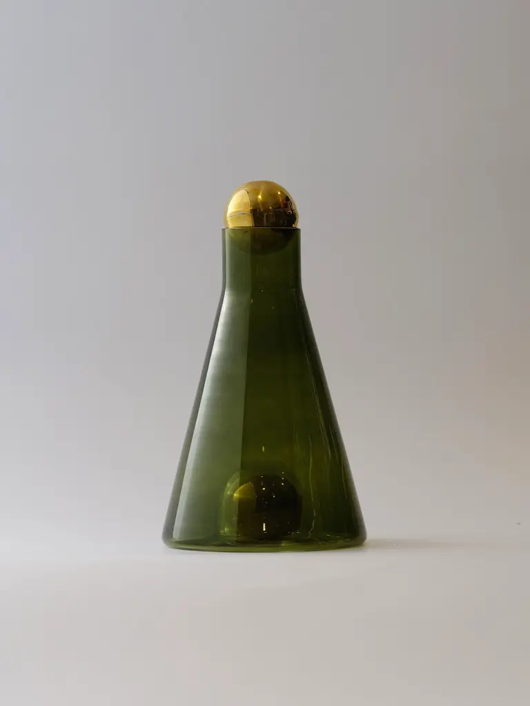 Green Cone-Shaped Glass Decanter With Brass Sphere Details