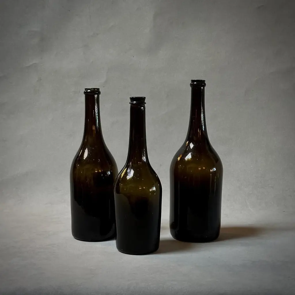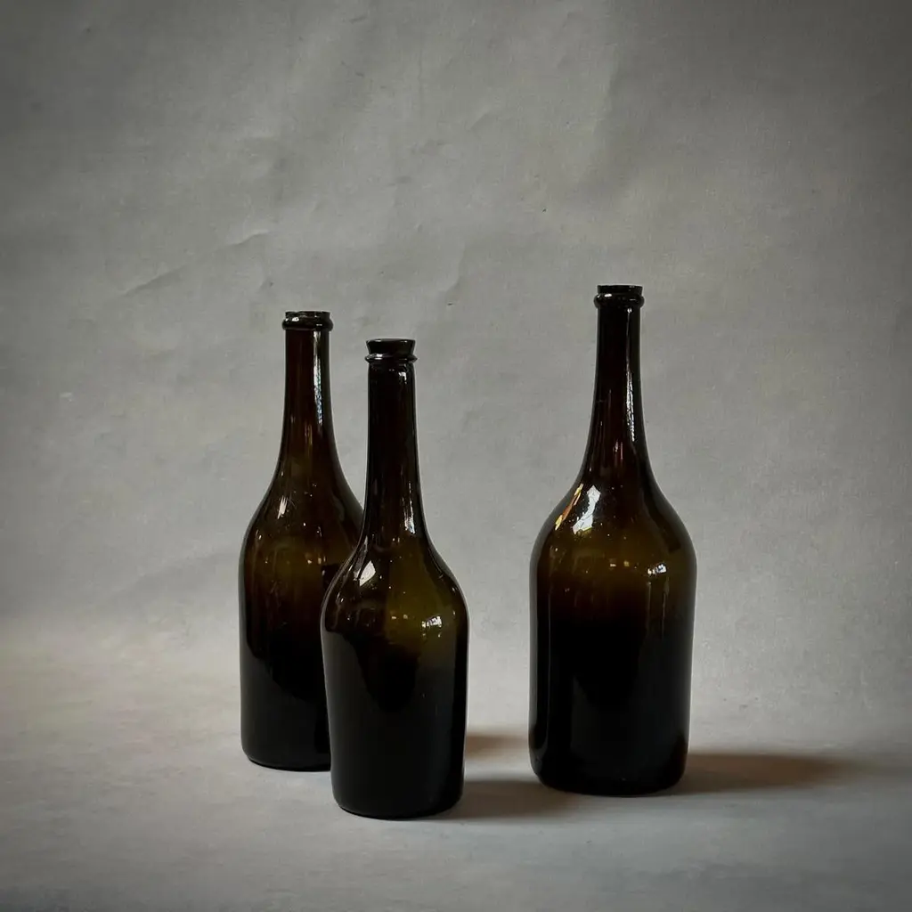 These French 19th-century hand-blown glass bottles, in a deep olive hue, exemplify rustic charm and artisanal craftsmanship. Each bottle, unique in its form due to the hand-blown process, serves multiple purposes: as a decanter, a vase, or simply as an aesthetic enhancer when clustered. Their rich luminosity and earthy tones make them a versatile addition to any decor.11 available. Molokai great as a set of the three in variations in size since they are hand-blown.France, circa 1880Dimensions: 3.5W x 3.5D x 12H