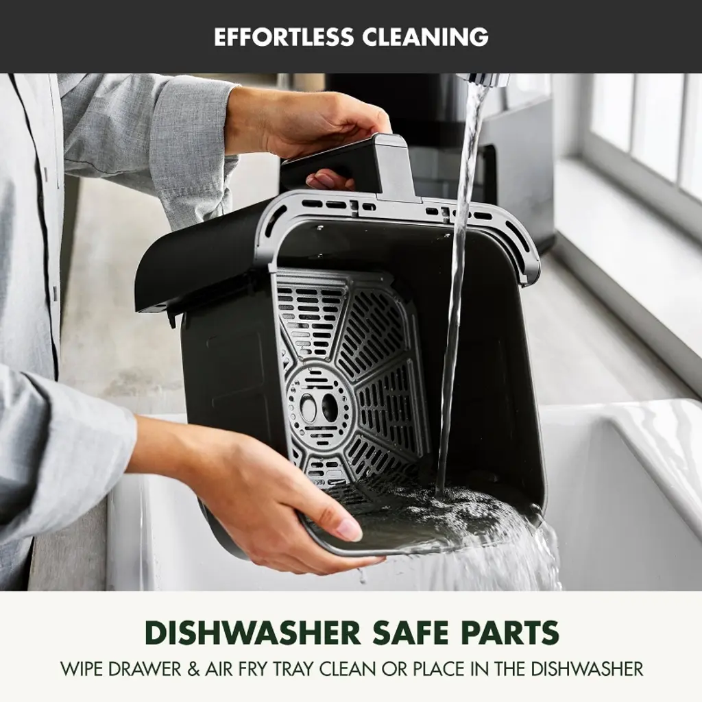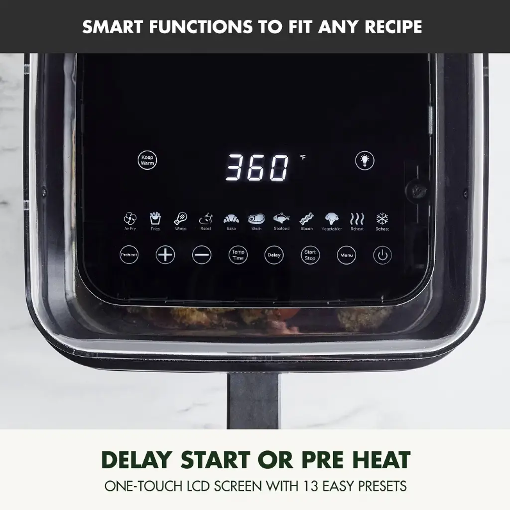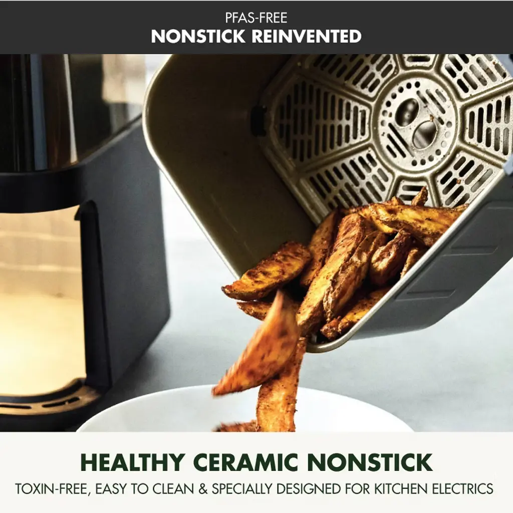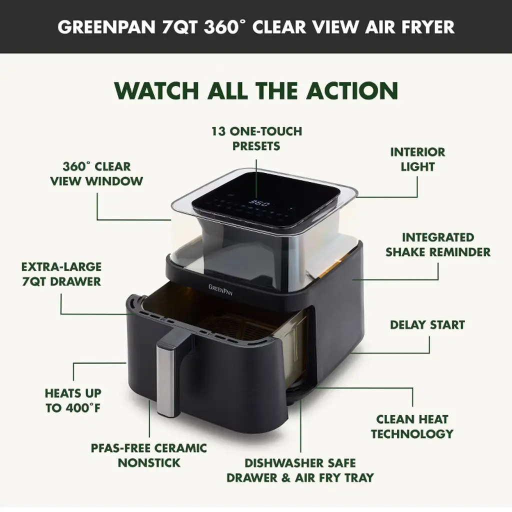Get a front-row seat to your meal with this see-through air fryer. With the 360˚ Clear View Window and handy interior light you can watch your meal develop and always know when your food is ready. GreenPan’s Clean Heat technology fries without oil and works with the PFAS-free nonstick interior to make healthy meals simple. The spacious 7QT drawer is perfect for large meals and pops out for easy plating, serving, and cleaning. With convenient functions like the integrated shake reminder, delay start, and optional preheat, this air fryer delivers optimal results just how you like it. When you’re through, simply wipe the drawer and air fry tray clean or place in the dishwasher.