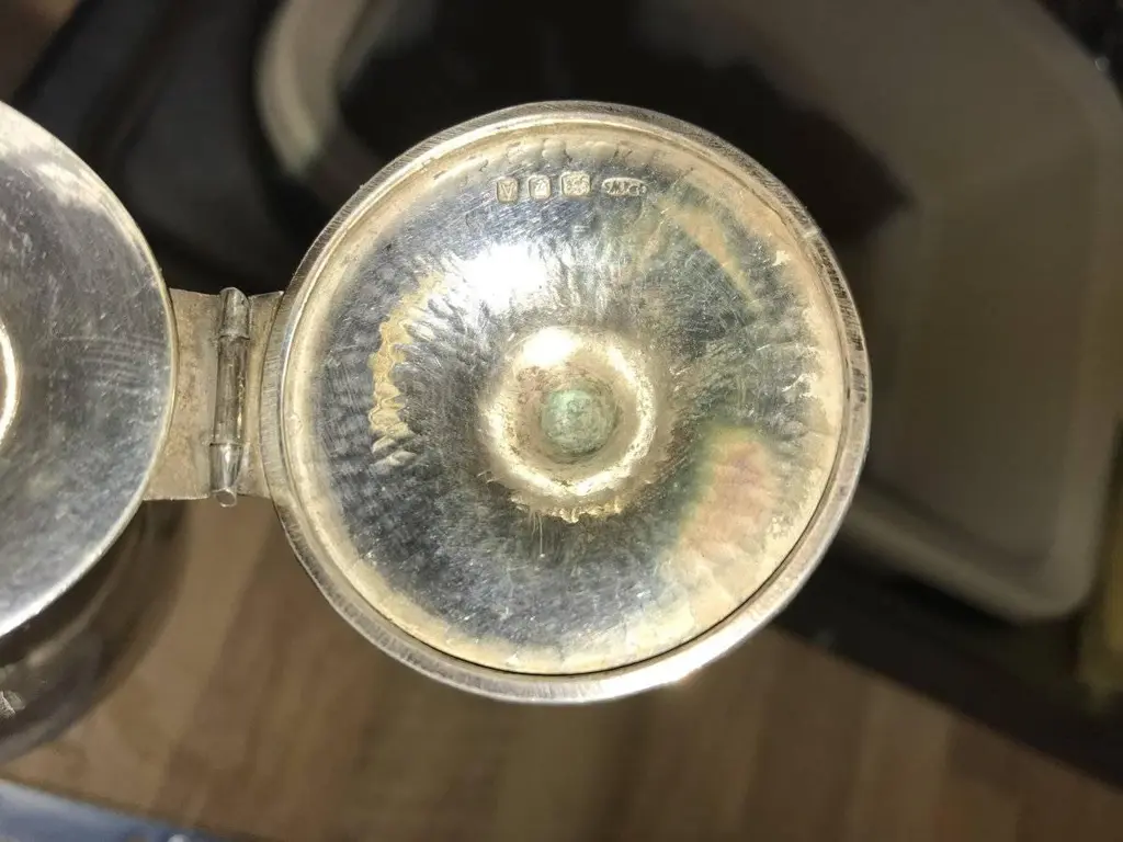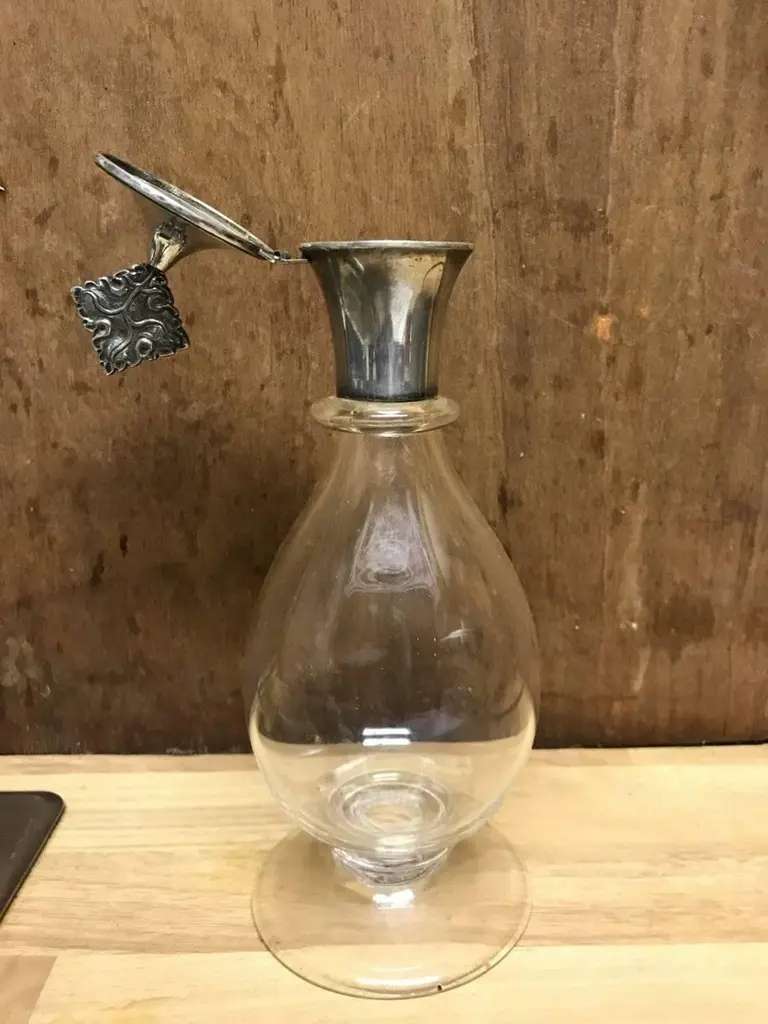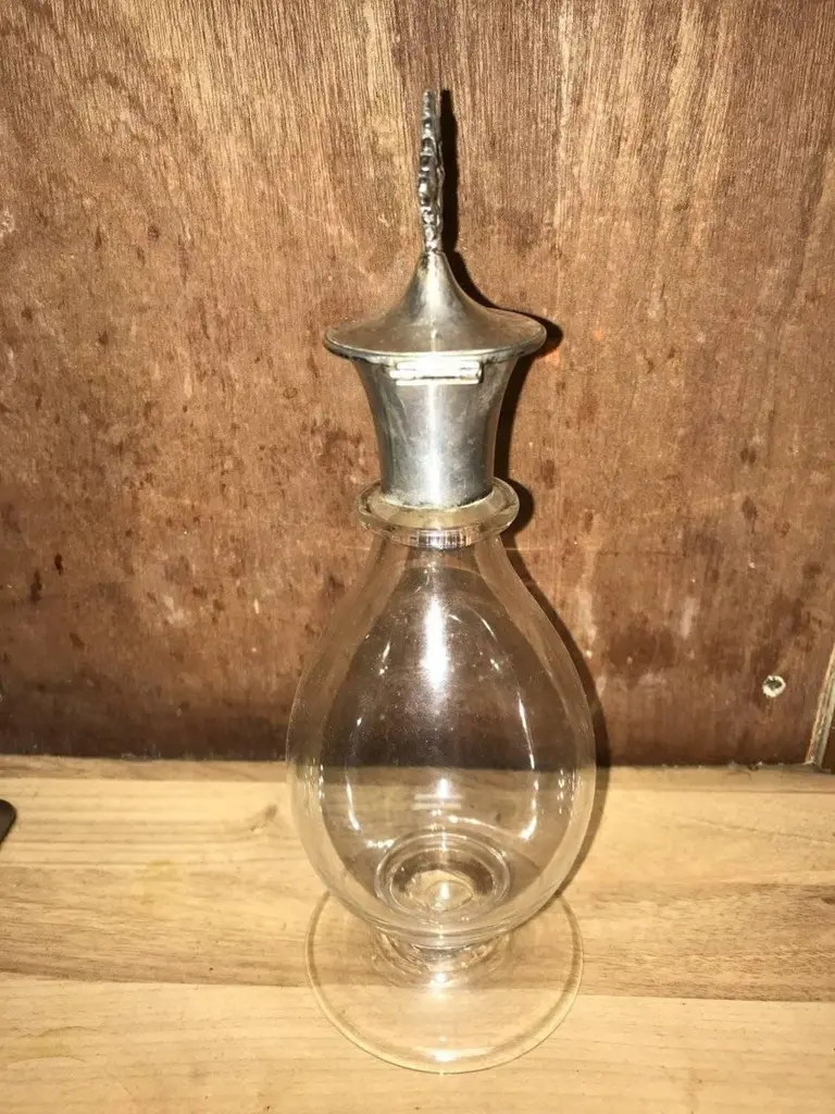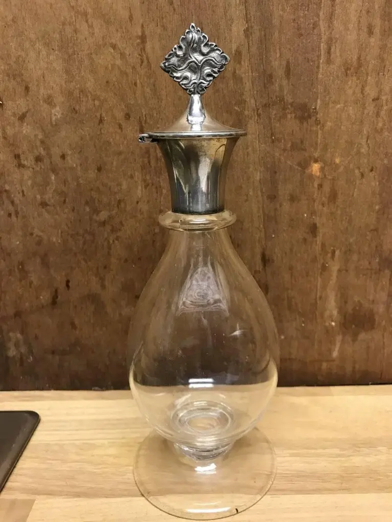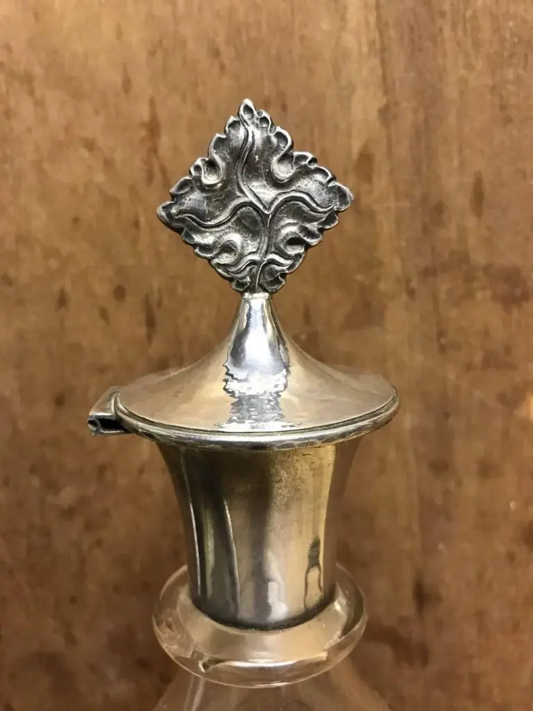 A pair of small decanters with silver tops and silver floral finials. Makers mark GD & WS are for Greenwood & Watts who worked in Hampstead, London. The date code for "A" is Circa 1876. In the manner of William Butterfield. The price of £1800 is for the pair.One lid requires silver braising as the weld has come free. It has no damage and it is a simple repair for a silversmith.