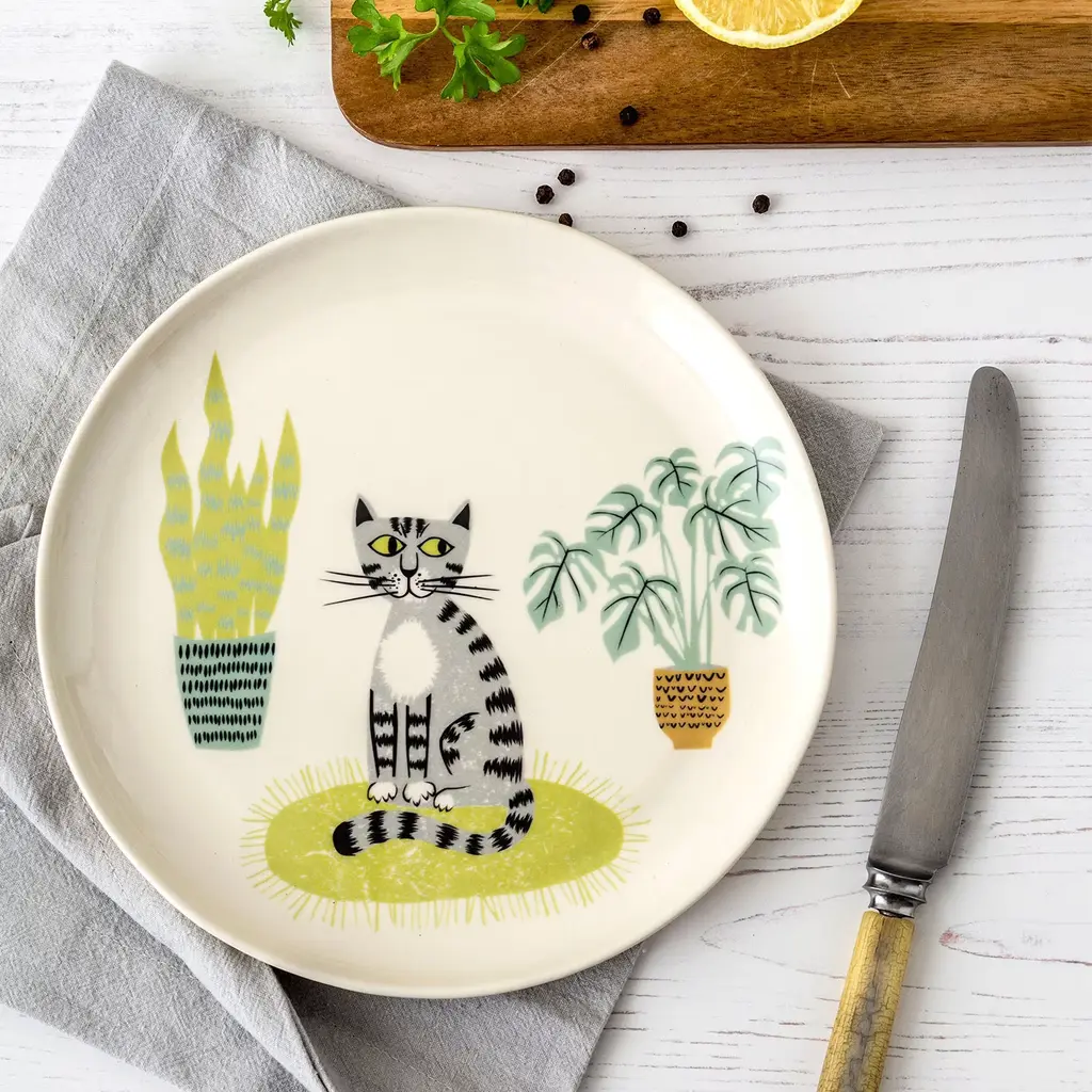 The Grey Cat Side Plate is part of Hannah Turner's Cat tableware collection and shows a grey tabby cat, sitting pretty on a rug surrounded by lush pot plants. The illustrative quality of Hannah's design gives the collection a stylish mid-century feel, complimented by the classic tones of mint, orange and sage.It comes beautifully packaged in a recycled card gift box, so perfect for birthday or Christmas presents, or just a treat for you? There are 2 Cat side plates for you to choose from.Handmade in Sri Lanka from stoneware ceramic.Microwave and dishwasher safe.20cm diameter.