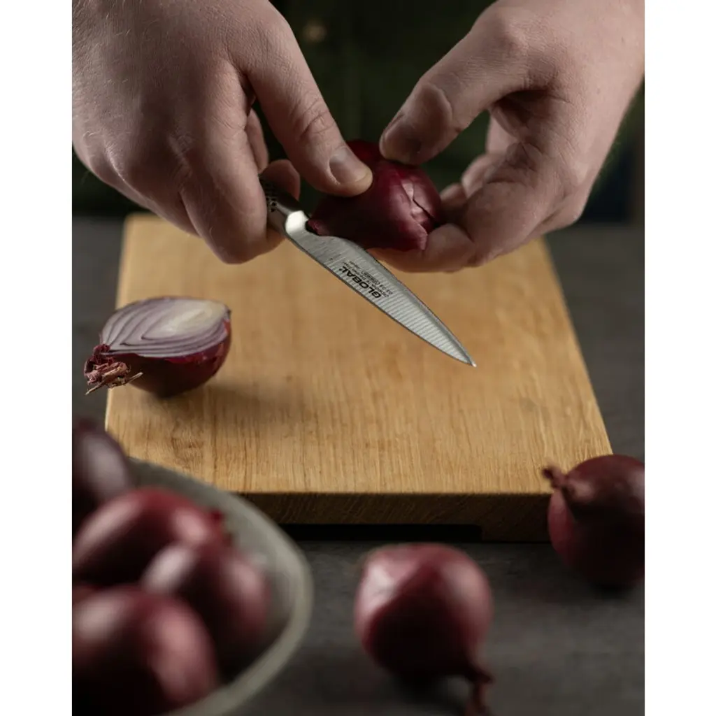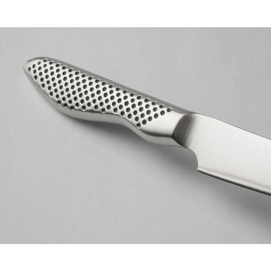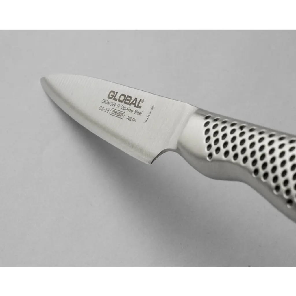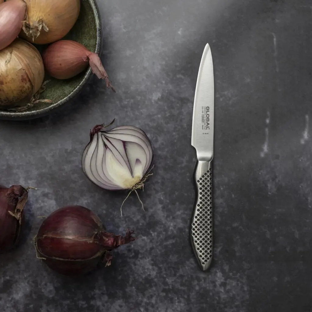 The Global GS-38 paring knife is a small, nimble kitchen knife with an ergonomically shaped handle and a 3.54 in (9 cm) blade – perfect for peeling, trimming and chopping root vegetables and other fresh ingredients. Crafted from all-stainless steel, the knife features a one-piece seamless construction that makes it exceptionally hygienic and easy to clean. The signature dotted handle is filled with sand to ensure a perfectly balanced grip. Designed by Komin Yamada, the knife performs brilliantly in both home kitchens and professional settings. Each Global knife is handcrafted in Japan, drawing on the tradition of samurai sword making. Forged from Cromova 18 – a high-grade, high-hardness stainless steel developed exclusively for Global – the blade offers excellent resistance to rust and corrosion. Thanks to its steep, acute cutting angle, the edge stays sharper for longer, delivering performance that surpasses conventional kitchen knives.