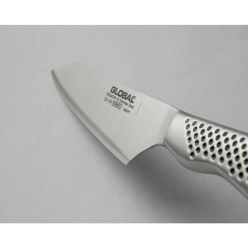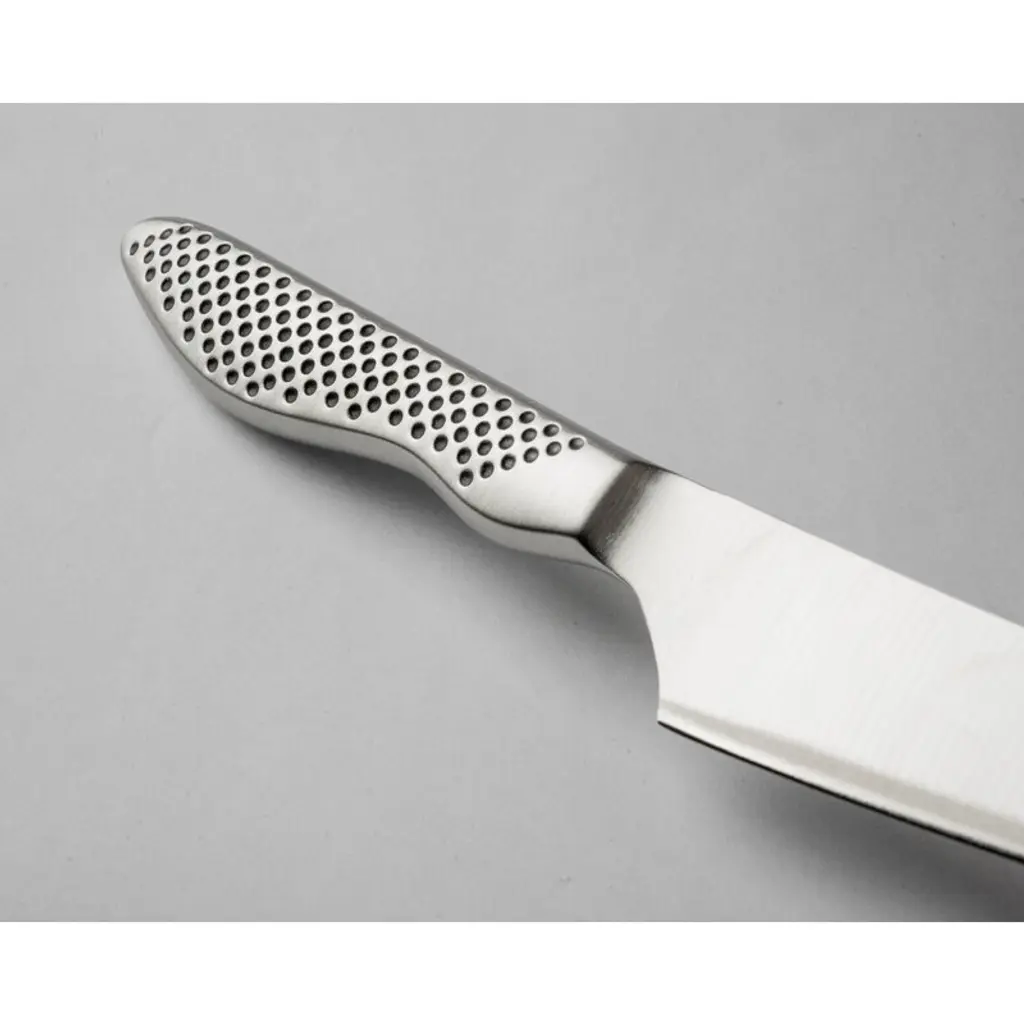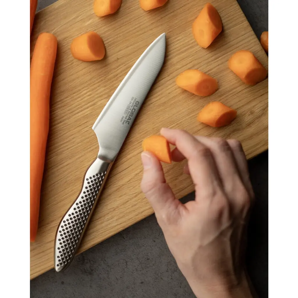 The Global GS-58 Oriental cook's knife is a compact utility knife that offers precision for chopping all kinds of ingredients. Inspired by oriental knives, it features a gently curved 4.33 in (11 cm) blade that allows for a rocking cutting motion. Crafted from all-stainless steel, the knife features a one-piece seamless construction that makes it exceptionally hygienic and easy to clean. The signature dotted handle is filled with sand to ensure a perfectly balanced grip. Designed by Komin Yamada, the knife performs brilliantly in both home kitchens and professional settings. Each Global knife is handcrafted in Japan, drawing on the tradition of samurai sword making. Forged from Cromova 18 – a high-grade, high-hardness stainless steel developed exclusively for Global – the blade offers excellent resistance to rust and corrosion. Thanks to its steep, acute cutting angle, the edge stays sharper for longer, delivering performance that surpasses conventional kitchen knives.