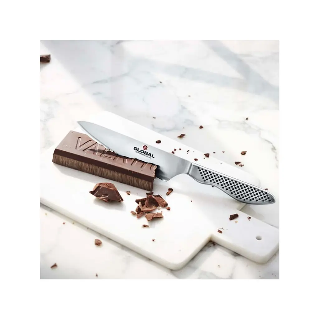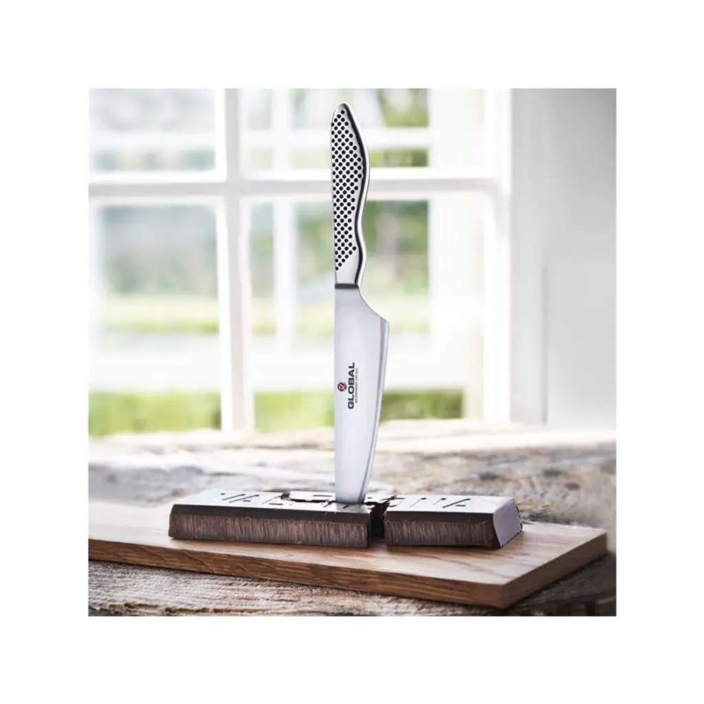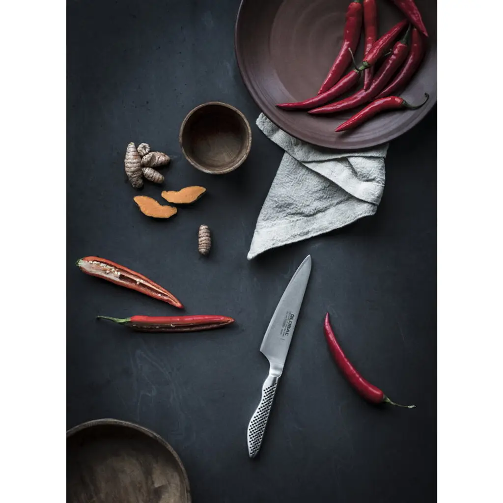 The Global GS-89 chef's knife is a compact all-purpose knife with an ergonomically shaped handle and a 5.12 in (13 cm) blade, ideal for cutting both meat and vegetables with ease and control. Crafted from all-stainless steel, the knife features a one-piece seamless construction that makes it exceptionally hygienic and easy to clean. The signature dotted handle is filled with sand to ensure a perfectly balanced grip. Designed by Komin Yamada, the knife performs brilliantly in both home kitchens and professional settings. Each Global knife is handcrafted in Japan, drawing on the tradition of samurai sword making. Forged from Cromova 18 – a high-grade, high-hardness stainless steel developed exclusively for Global – the blade offers excellent resistance to rust and corrosion. Thanks to its steep, acute cutting angle, the edge stays sharper for longer, delivering performance that surpasses conventional kitchen knives.