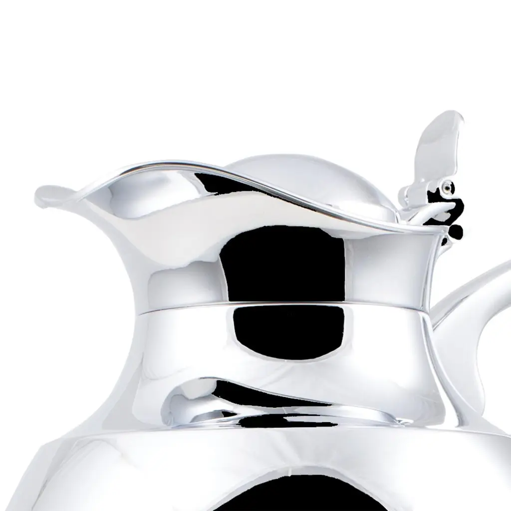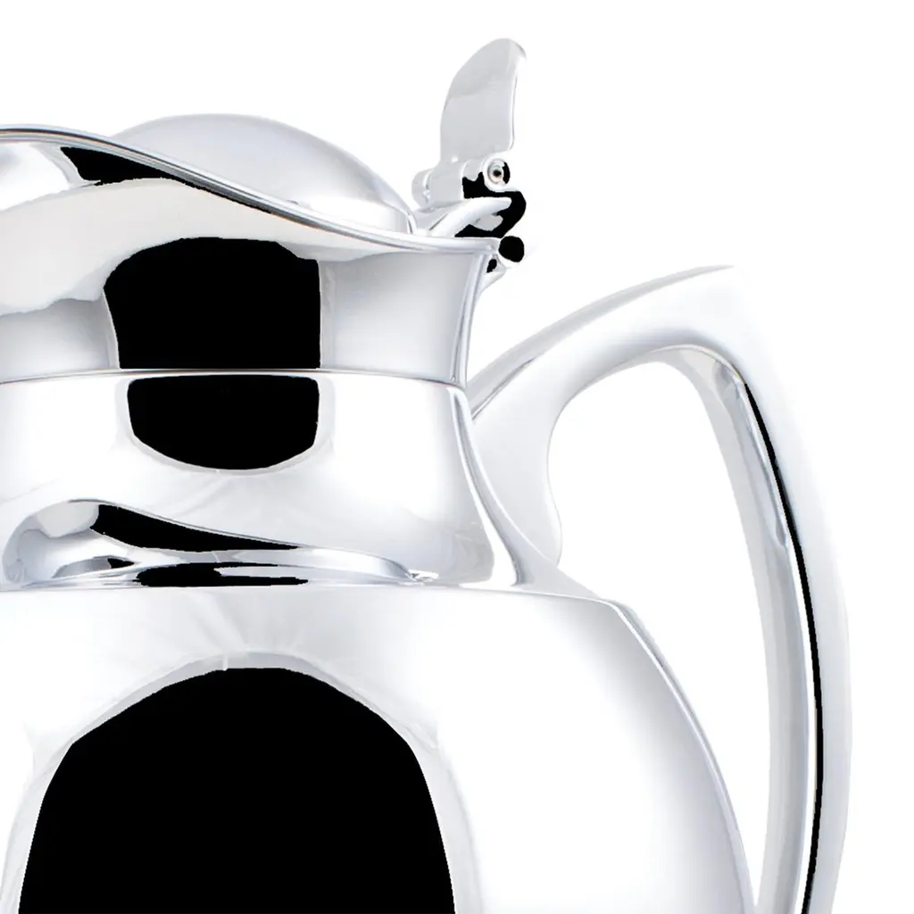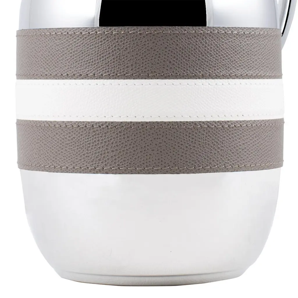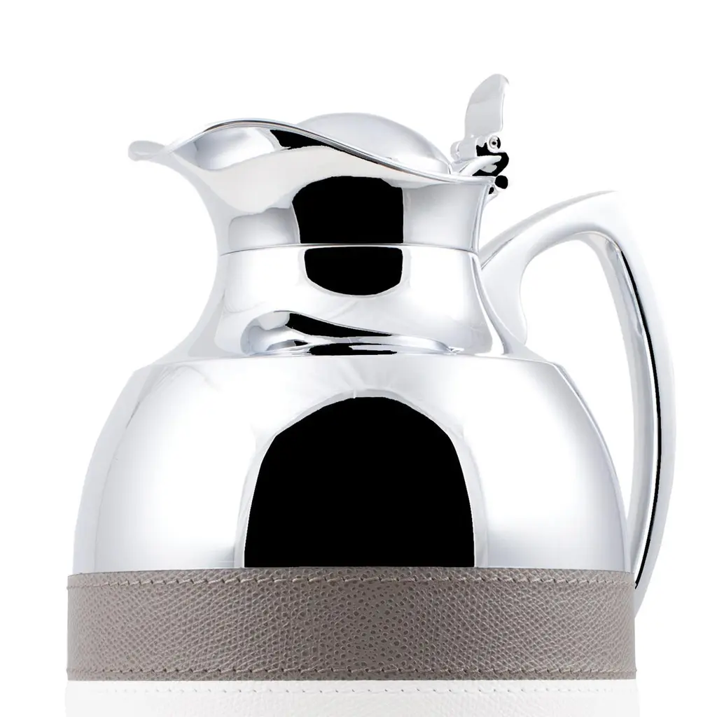 Thermos Guapa in solid brass in chrome plated finish.Partially covered with genuine leather. Maintains 1 liter liquid’s temperature for up to 12 hours.Also available with other leather colors finish on request.