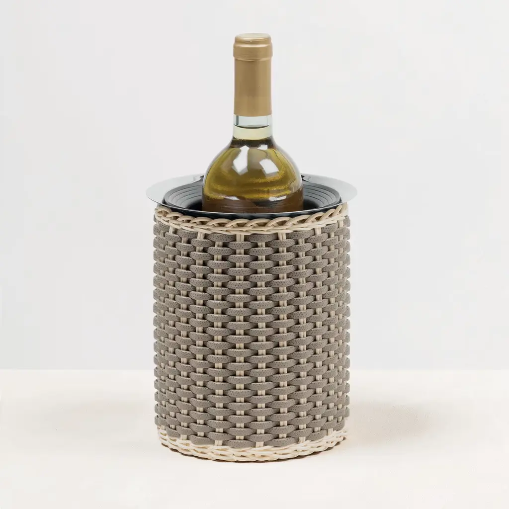This splendid bottle cooler will make a sophisticated addition to a special occasion thanks to its refined rattan and beige Napa leather upholstery, superbly hand-woven around its cylindrical silhouette in stainless steel. Marked by a double-walled and insulated structure that will keep bottle cools for several hours while adding a charming accent to the dining table.