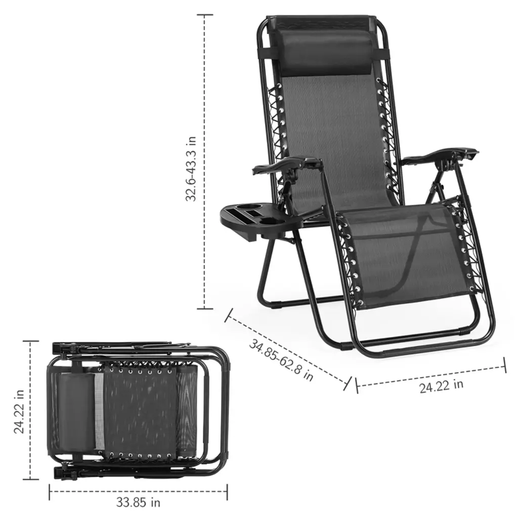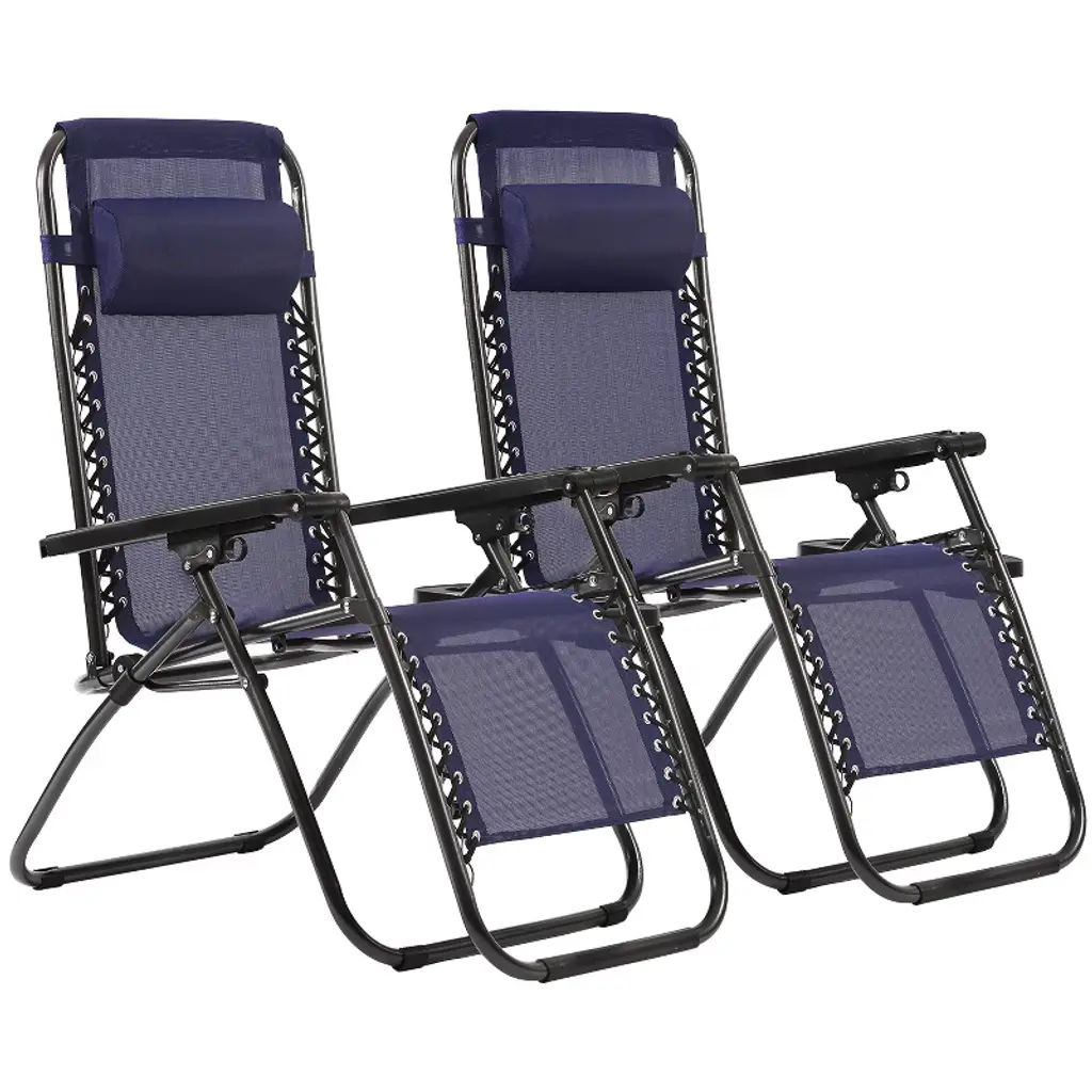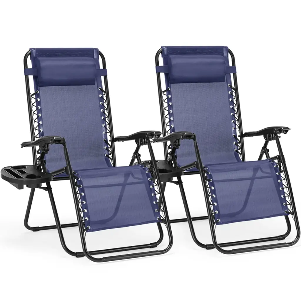 Gulches Set of 2 Black Zero Gravity Lounge Chairs adds sleek style to outdoor areas like patios, pools, or beaches. Each folding recliner includes a supportive pillow and built-in cup holder, while the zero-gravity design promotes comfort by distributing weight evenly. Durable for outdoor use, they fold compactly for storage, making them a practical choice for couples or small groups.