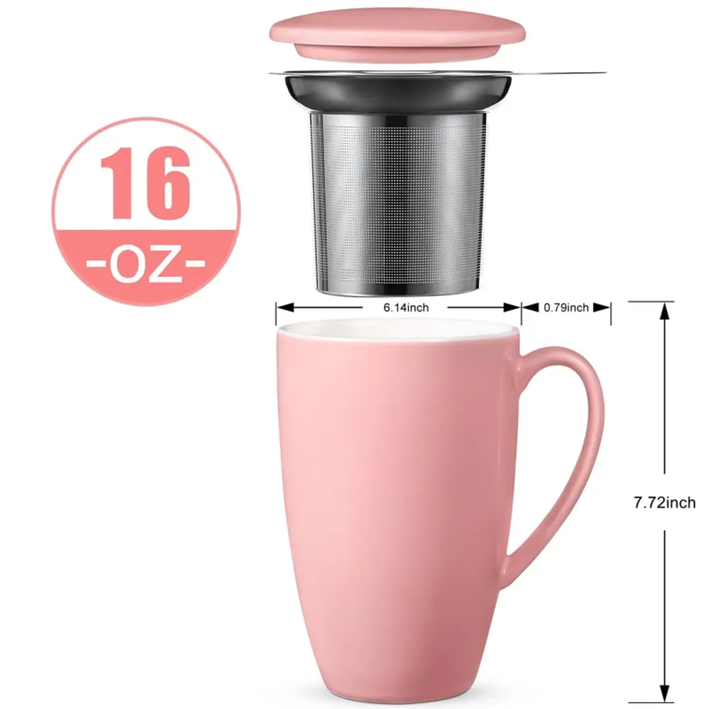 Gustowave 16 Oz Porcelain Tea Mug With Infuser And Lid – Microwave Safe, Ergonomic Handle, Lead-free Glaze, For Loose Leaf Tea, Light Pink