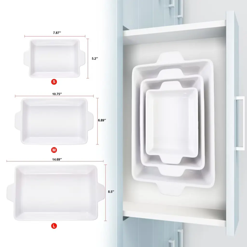 Premium Porcelain Bakeware Set - This 3-piece lead-free ceramic baking set includes versatile sizes (11.7", 8.74", 6.5"L) with scratch-resistant glaze and non-toxic, non-stick coating for effortless food release and reduced oil use. The oven-safe dishes (up to 450°F/232°C) feature chip-resistant construction with easy-clean surfaces (dishwasher safe) for baking, serving, and reheating everything from pizzas to roasts. Each piece's durable porcelain maintains brightness through repeated use, while the stylish design makes it ideal for gifting to cooking enthusiasts. Includes: ①11.7"L×8"W×2.7"H ②8.74"L×6"W×2.4"H ③6.5"L×5"W×2"H for portioned meals.