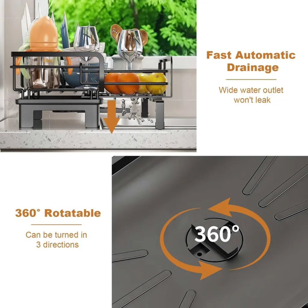This sink organizer drying rack combines durable stainless steel with a practical plastic drip tray, offering rust resistance and easy cleaning. Its versatile 2-in-1 design includes an extendable drying shelf for extra space that tucks away when not needed. Featuring a rotatable water spout for efficient drainage and a removable cutlery holder with divided compartments, it provides organized and convenient drying for all your kitchen utensils.