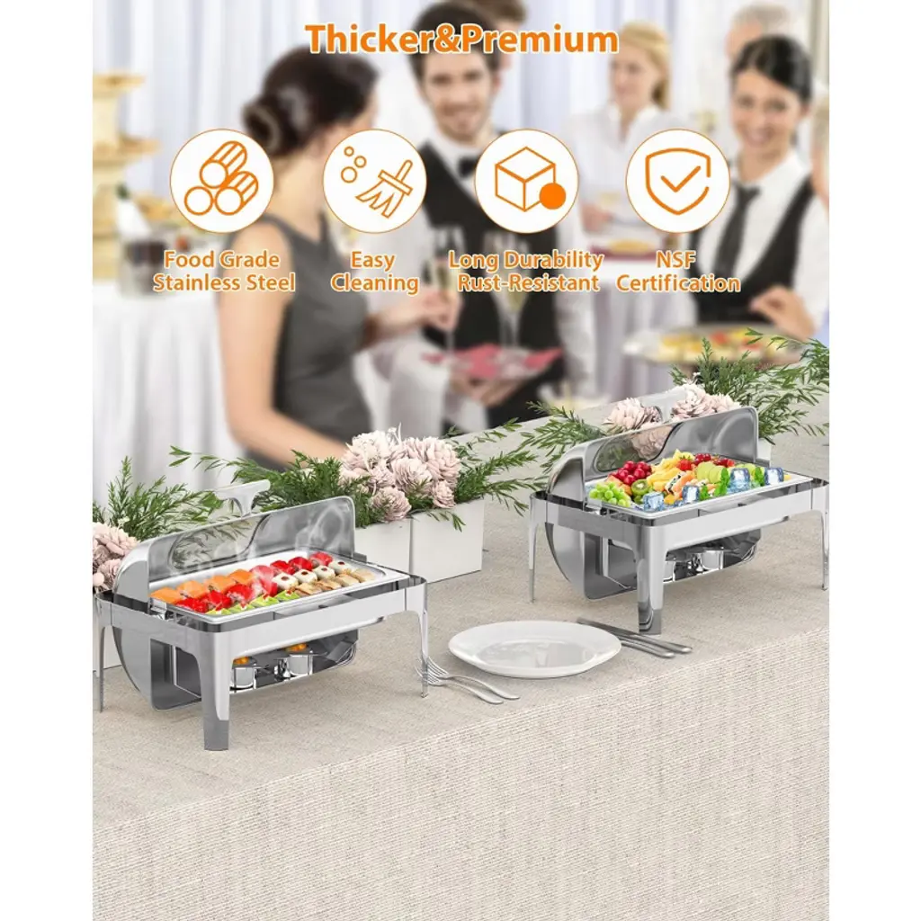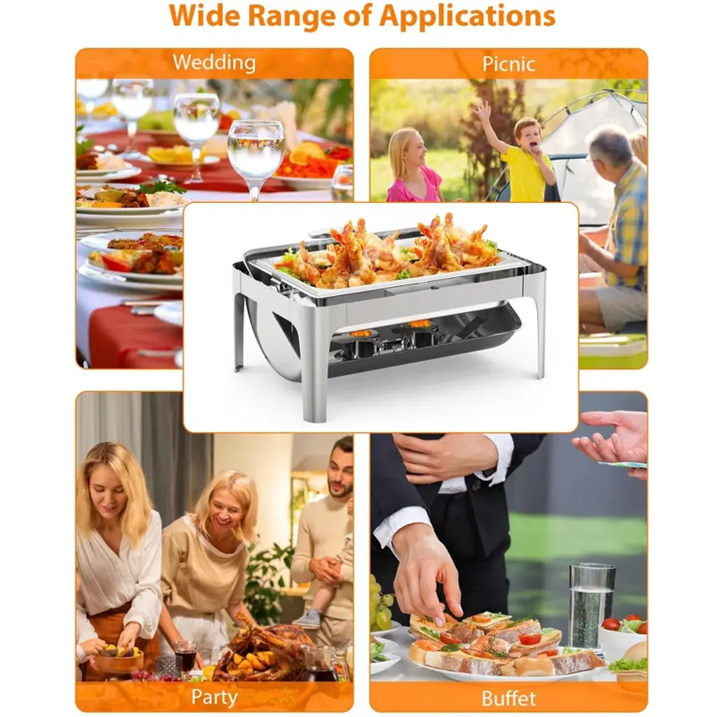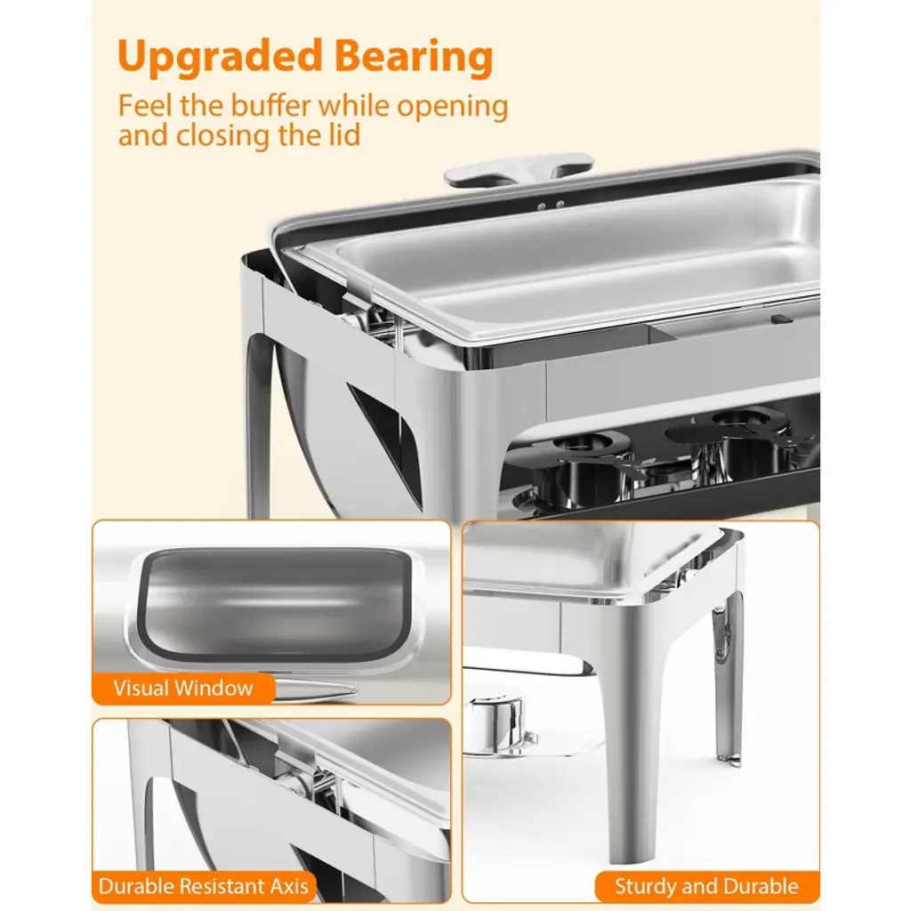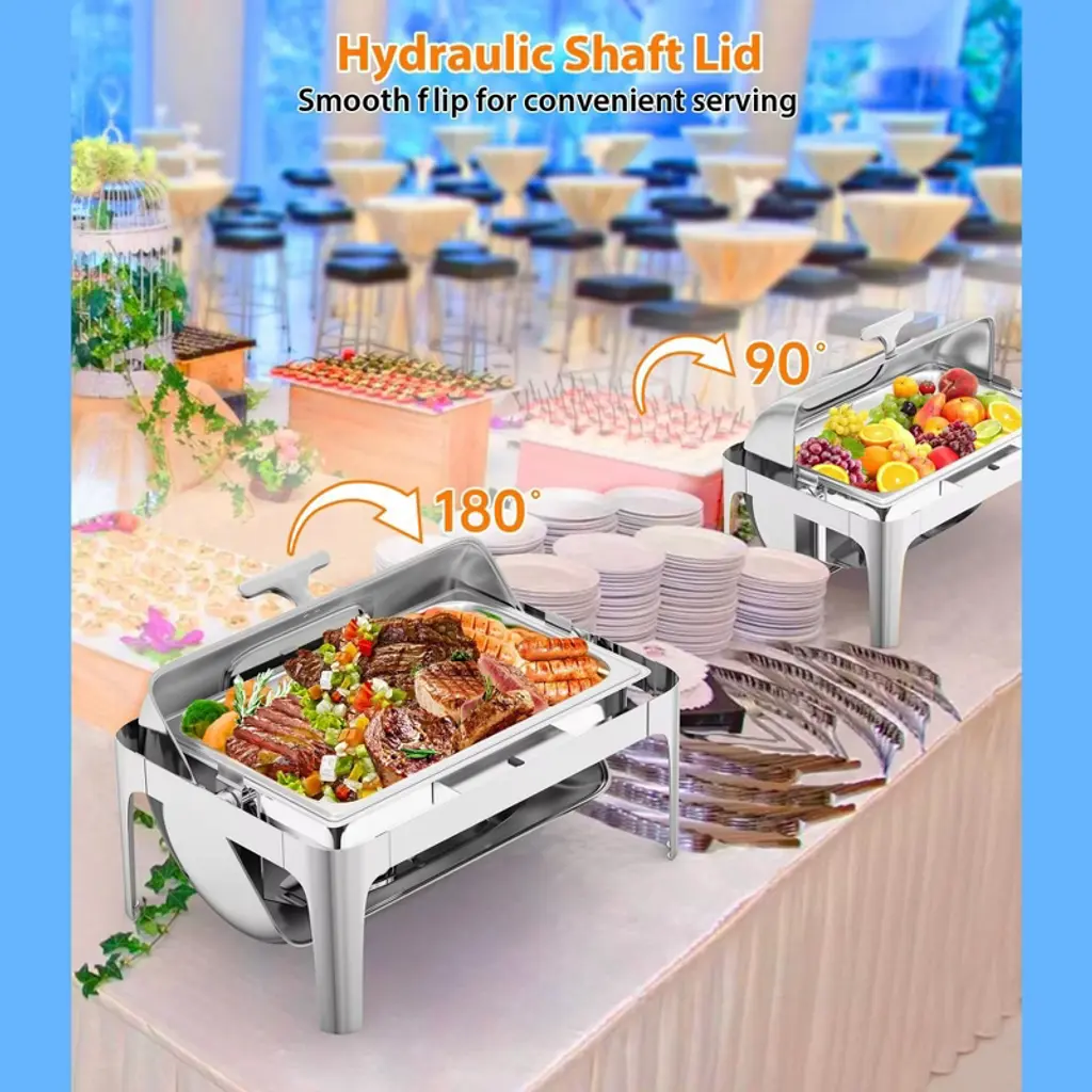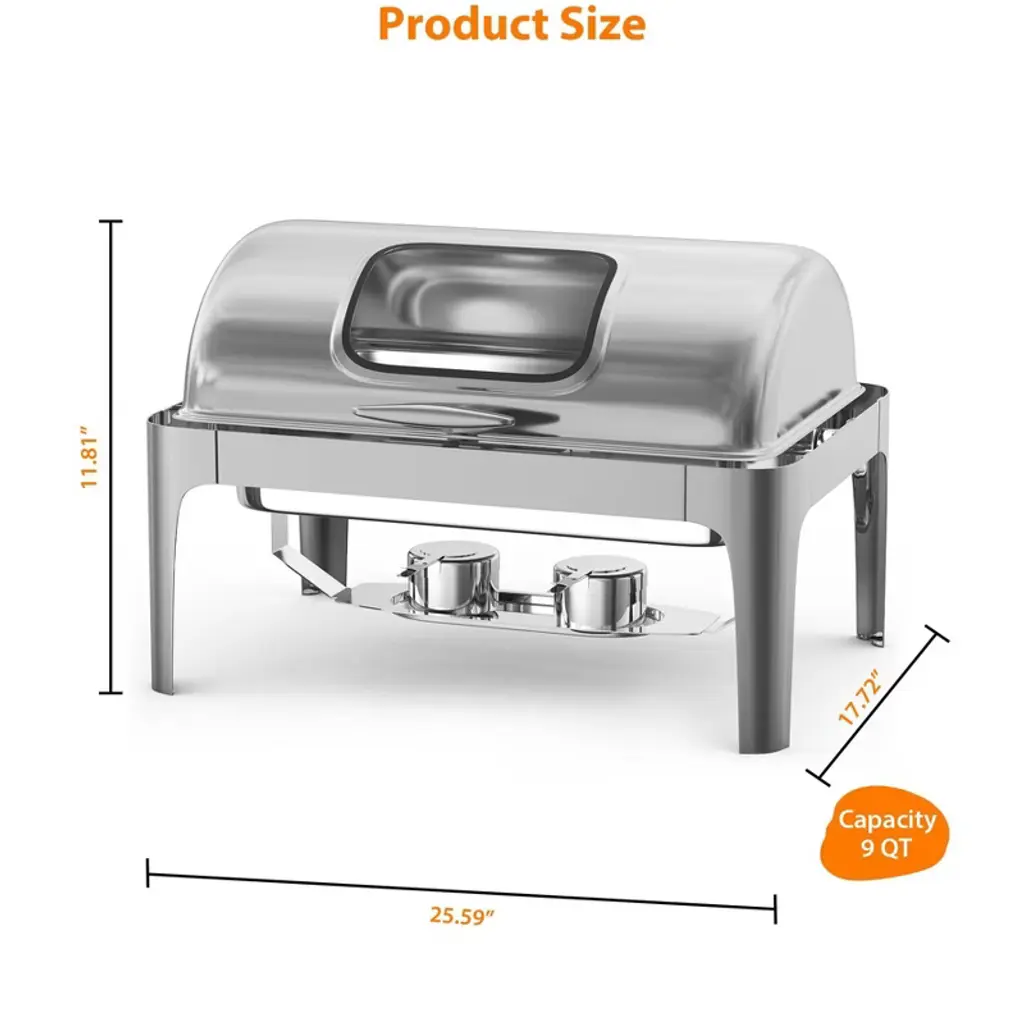 This stainless steel chafing dish features a clear glass window on the lid, allowing you to view food without opening it, helping to maintain temperature and reduce heat loss. Designed with thickened, high-grade stainless steel for durability and better heat retention, it offers flexible serving options with a 90° or 180° roll-top lid. The chafing dish can keep food warm using hot water and fuel or cold with ice in the water tray, making it ideal for professional catering, buffets, restaurants, and events.