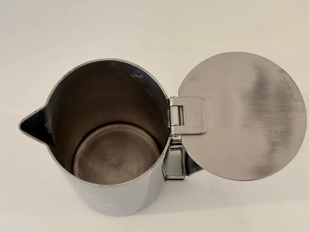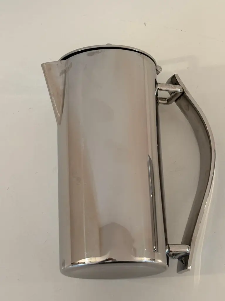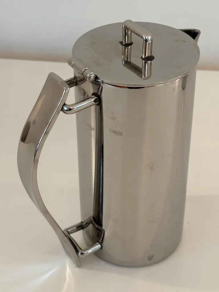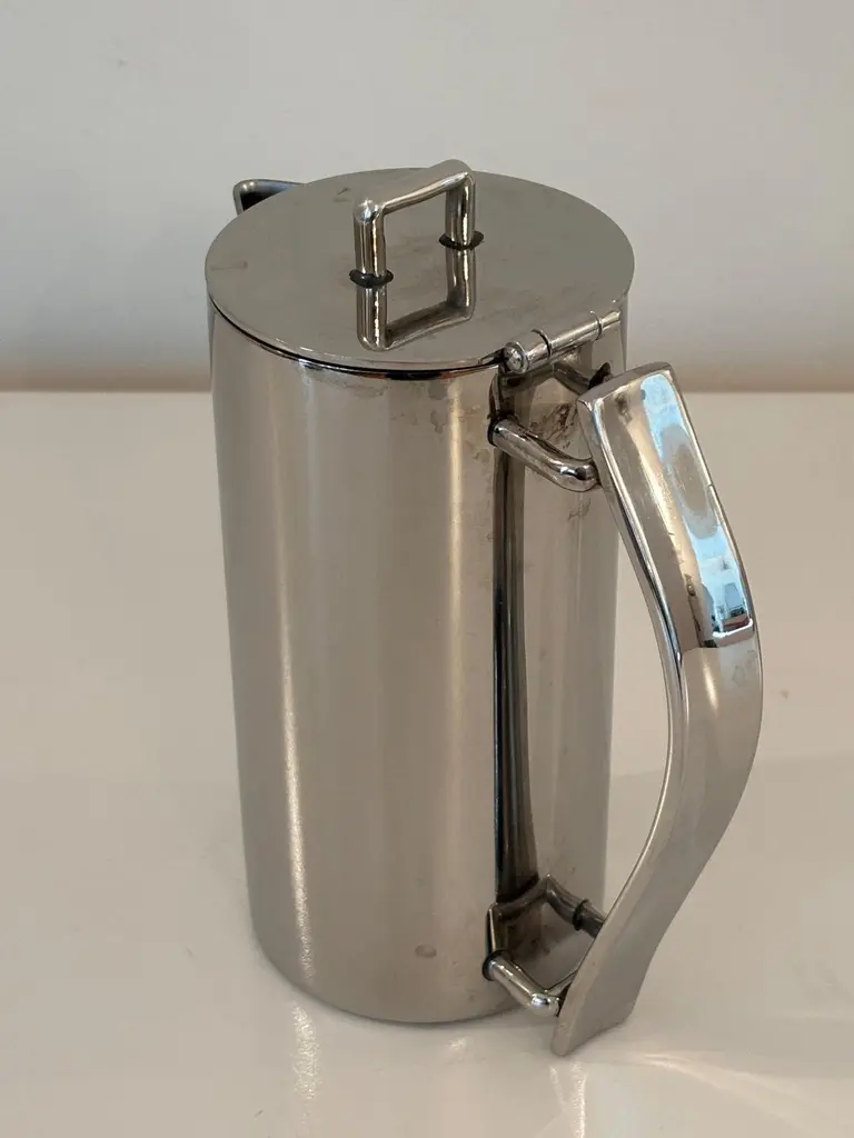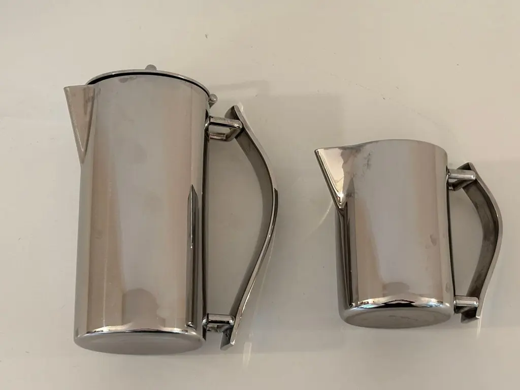 Guy Degrenne Paris Newport coffee pot or teapot and creamer set in stainless steel, Art Deco Inspired.Guy Degrenne Paris, the Newport model is an exclusive design for your breakfast, bar, buffet and table service needs.Set of one tea or coffee pot and one creamer jug by Guy Degrenne Paris, Marked.Made from 18-10 steel this contemporary and classic Art-Deco-inspired range goes perfectly with any porcelain collections.The Guy Degrenne metal stainless steel coffee or tea pot and the jug creamer accompanies the serving of coffee, tea or chocolate on the table of gourmets and gourmands.Dimensions: Pot: 7 in height x 5 in with handle x 3 in diameterDimensions: Creamer:4 in height x 4.5 with handle x 2.75 diameter. Specific collection model : NEWPORT CAFETERIE Material : Stainless steel Color : GreyThe Degrenne Group was founded by Guy Degrenne with a presence in more than 30 countries. Degrenne tableware collections make a statement. Since its beginnings, the same approach has characterized the brand Degrenne: Combine quality functionality and aesthetics to innovate with collections of porcelain dishes. Noble materials, elegant decorations, clean lines; Degrenne tableware collections can be combined to play with contrasts of shapes, colors, or materials to enhance the effect of food on your senses. Degrenne makes it possible to create magical moments at each meeting thanks to unique pieces of tableware that embody excellence.