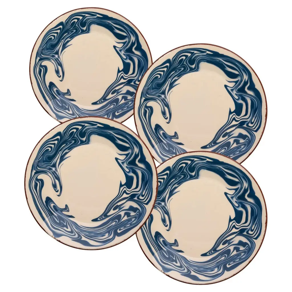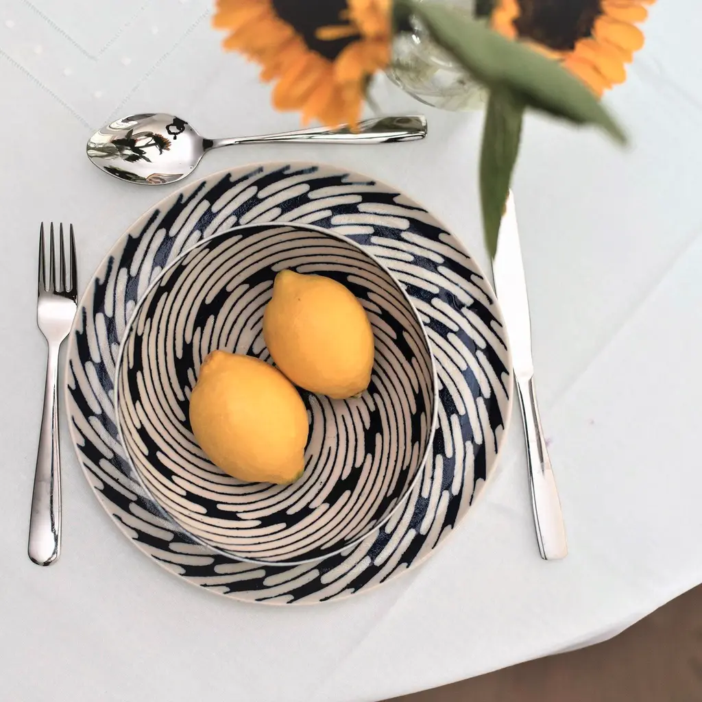 The Gweru Modern Dinner Plates Set 4 is molded, decorated and glazed by hand in Zimbabwe. The unique plates have a basket weaving pattern with a dark blue border and a white base. The ceramic set of four plates dress up a dining room table. Each plate showcases a slightly different yet complementary spiral design. Dinnerware sets for 4.