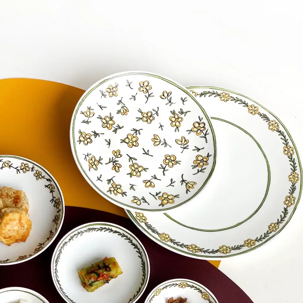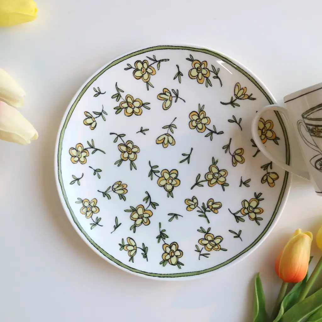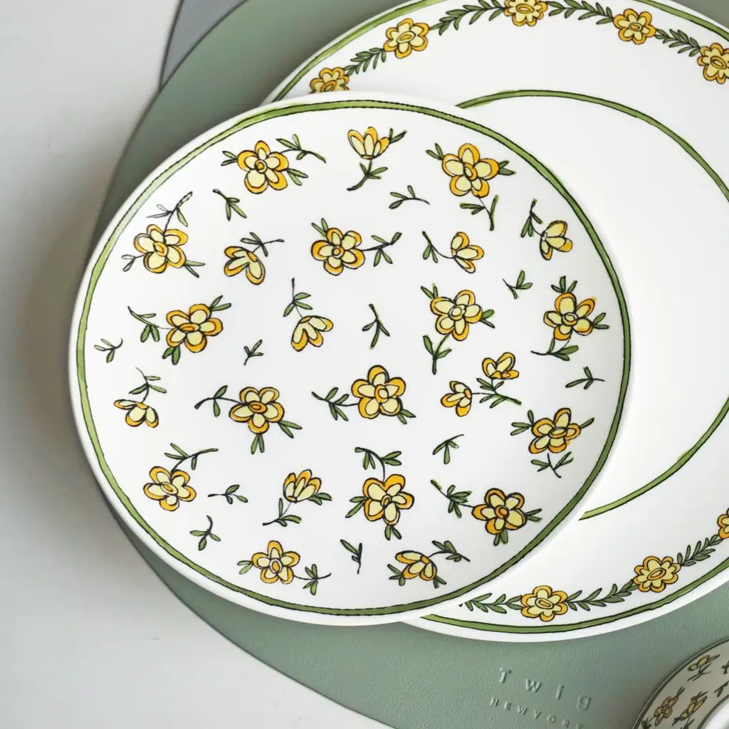 The Daisy Chain Collection by Twig New York in collaboration with Molly Hatch. The second collection to grow out of the successful Heritage Collection series, this collection gives you the opportunity to adorn your table with the floral yellows and greens of Daisy plants. In keeping with the ideas behind the Heritage Collection, the use of bold designs and patterns create something instantly unique that straddles both the modern and the classic. With a textured feel and designs on the bottom surfaces as well, the Daisy Chain Collection definitely catches the eye.Ideal for Salads and SnacksOne plate per boxFine Bone China with hand-applied decalPlate: 8.5 in. diameterDishwasher & Microwave safeH.Daisy Chain Collection