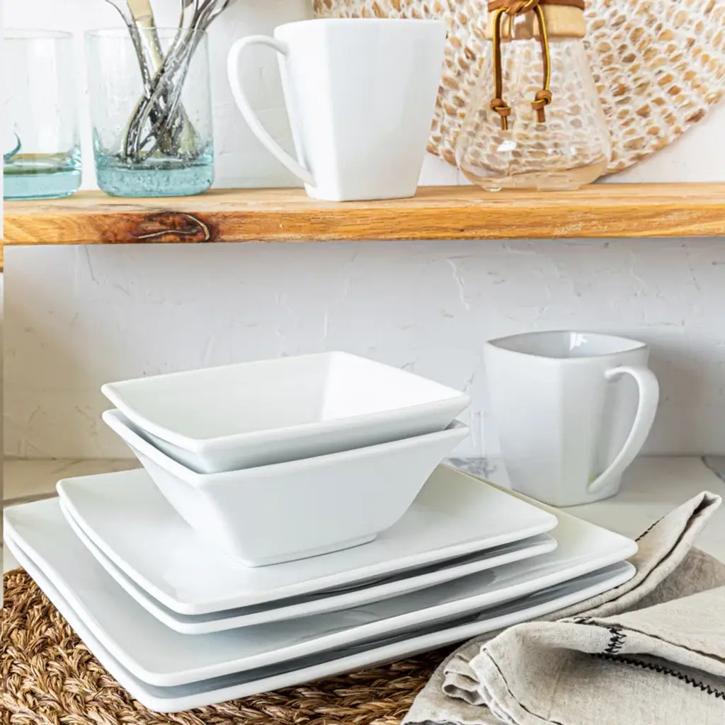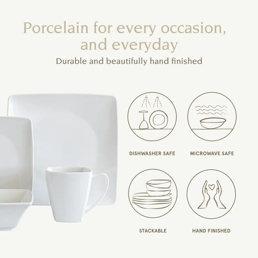 Square sophistication. Our 32-piece dinnerware set elevates your dining experience, featuring a contemporary square design. Crafted from semi-handmade porcelain china, this set includes dinner plates and salad plates for a service of eight. Perfect for gatherings both formal and casual, the chic white finish complements any table setting. Dishwasher and commercial oven safe, this modern dinnerware set ensures both style and functionality. Make every meal a culinary masterpiece with our exquisite collection.