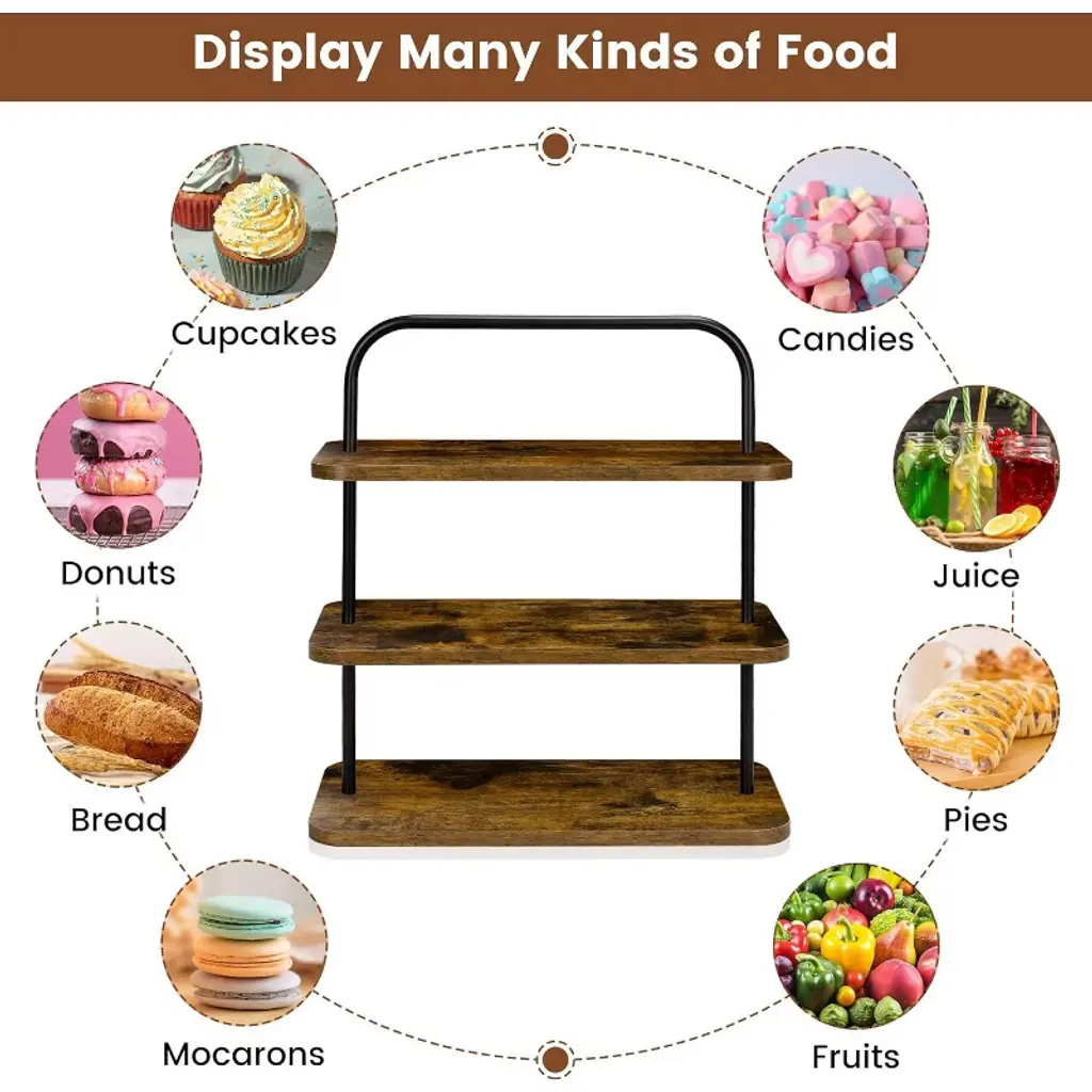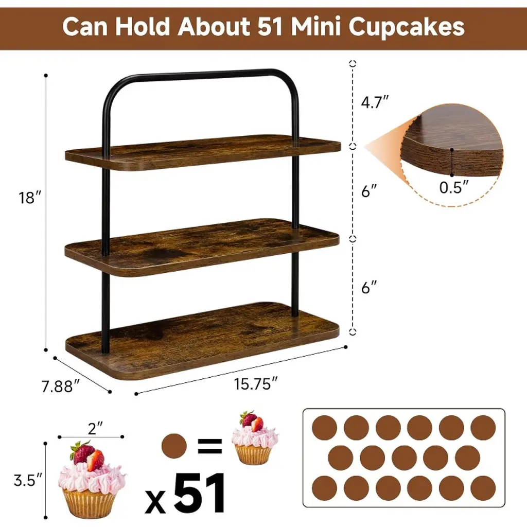 Elevate your dessert presentation with this 3-tier rustic wood cupcake stand—ideal for showcasing up to 51 mini cupcakes or a variety of treats at parties, weddings, birthdays, and beyond. Featuring a convenient top metal handle for easy carrying, this stand blends warm, rustic MDF wood with a sleek black metal frame to bring modern elegance to any event or home space. Crafted with 12mm-thick, waterproof MDF wood and a sturdy metal structure, each tier supports up to 4 lbs, ensuring stability for cupcakes, donuts, cookies, fruits, or even home decor items like cosmetics and figurines. Whether you’re hosting a birthday celebration, wedding reception, or using it as a stylish storage solution at home, this versatile stand merges functionality with charming design. Assembly is quick and easy (tools included, takes just 5 minutes), and cleaning is a breeze—simply wipe with a damp cloth. From party centerpieces to everyday home organization, this cupcake stand adds rustic sophistication to every moment.