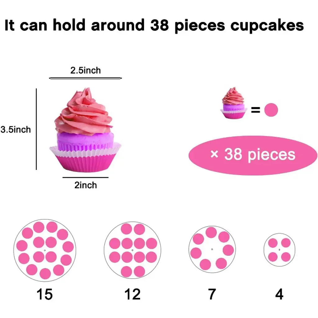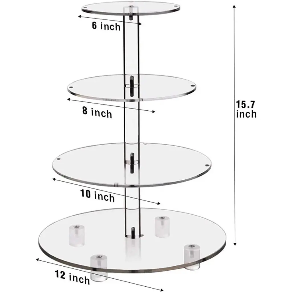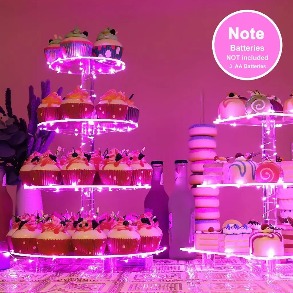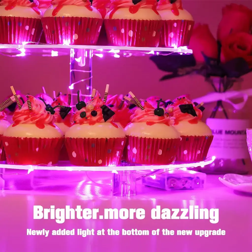 Searching for a special, exquisite way to showcase your cupcakes? Look no further! Our 4 Tier Acrylic Cupcake Stand blends European elegant design with practicality, turning weddings, anniversaries, birthdays, and candy bar setups into more romantic, memorable events¡ªall with a stunning dessert display that shines, thanks to its pink LED glow.? Crafted with premium 4mm thick acrylic, this stand is exceptionally solid and durable for repeated use. Its 4 acrylic plates (with 4¡± spacing between tiers) are fully removable, so you can customize the setup freely: remove a plate for taller treats, or keep all tiers to maximize holding space. The acrylic rods feature embedded copper nuts in the middle, keeping the stand perfectly straight and stable¡ªno wobbling, even when loaded with treats. Plus, it¡¯s generously sized: hold up to 52 cupcakes (2.5¡± diameter) or 12 lbs of pastries, perfect for feeding party guests.? As a special bonus, we include a pink LED light string that adds a magical, romantic glow to your display¡ªmaking your desserts and party decor feel extra charming. The stand also has a smooth, polished edge finish (no sharp corners!) and rubber dots on the bottom to prevent slipping, keeping your precious pastries safe and secure.
