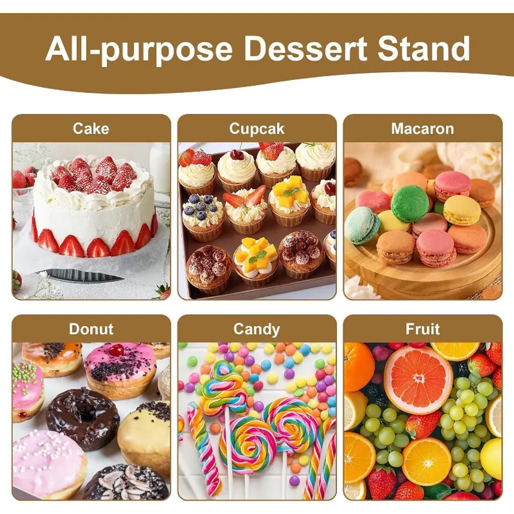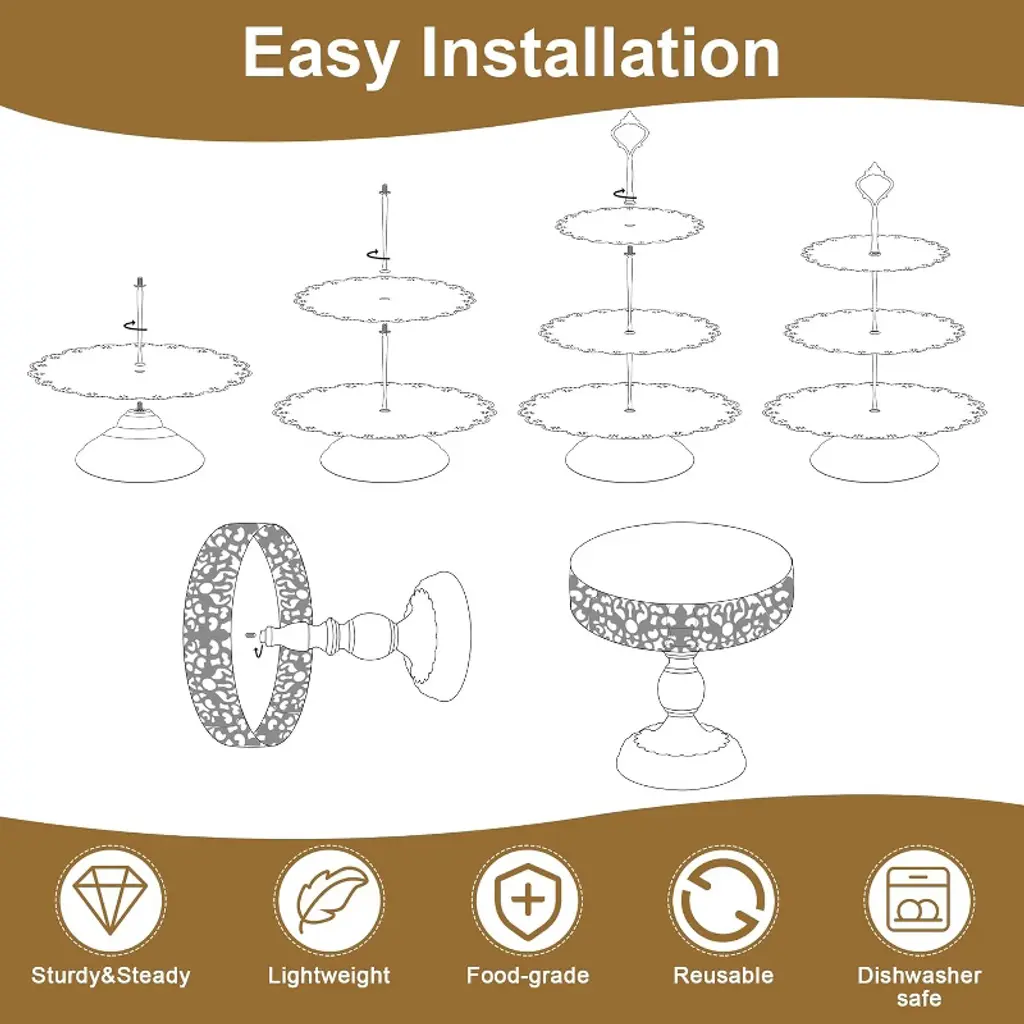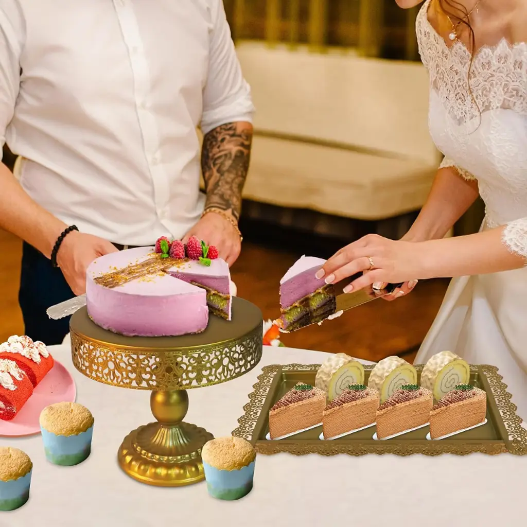 Elevate your dessert presentation with this 5-piece gold metal dessert stand set—a perfect blend of elegance and functionality for every celebration! The set includes 2 tiered cupcake stands (with handles for easy carrying), 1 ornate cake plate, and 2 decorative serving trays—all designed to showcase cakes, cupcakes, cookies, macarons, and more in stylish fashion. Crafted from durable metal with a luxurious gold finish, each piece features intricate detailing and sturdy construction. This ensures long-lasting use while adding a touch of glamour to weddings, baby showers, birthdays, holiday parties, or any special occasion. Whether you’re a professional baker displaying creations or a home host curating a dessert table, this set transforms ordinary treats into a stunning focal point. Setup is hassle-free (no complex assembly required), and cleaning is simple—just wipe with a damp cloth after use. Plus, built-in handles on select stands make transporting desserts from kitchen to party space effortless, so you can easily impress guests with a polished, Instagram-worthy display.