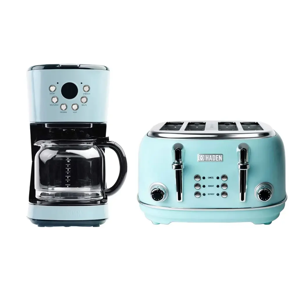 Haden 12 Cup Programmable Drip Coffee Maker Coffee Machine Bundled With Heritage 2 Slice Wide Slot Stainless Steel Toaster, Turquoise & Chrome