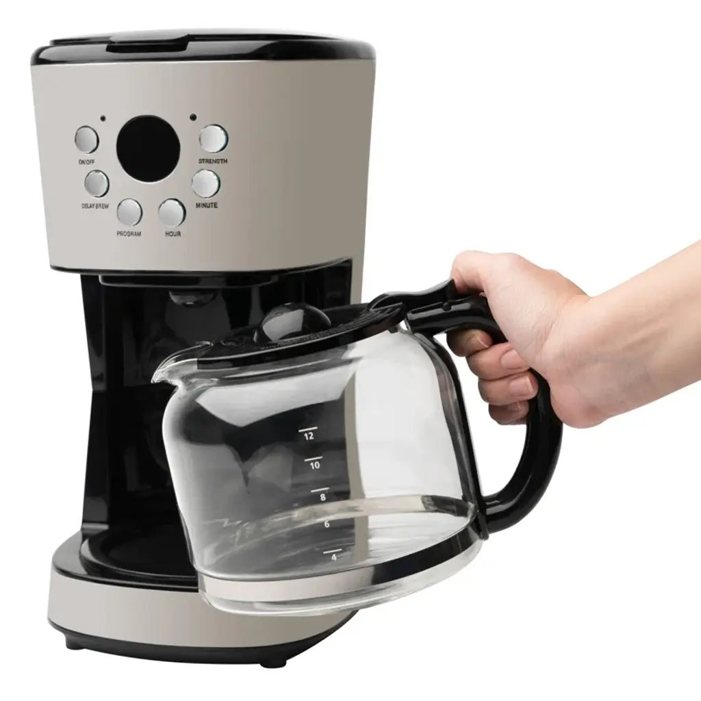 Produce the perfect cup of coffee with ease and style with the filter coffee maker. The elegance will add a touch of class to any kitchen. This coffee maker has six functions including on/off, delay brew, program, hour, minute, and strength. It also has an LCD and a thirty-second anti-drip feature. The 1.5 liter/12 cup glass carafe and funnel are also dishwasher safe for added convenience. This coffee maker also has a keep-warm feature, so if one cup isn’t enough you can simply pop back and pour yourself another cup!