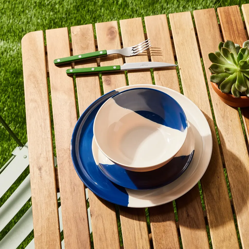 This dinnerware may look like it belongs in a pottery gallery, but—surprise!—it’s actually made of shatterproof melamine. You’ll find color pairings galore here, each one dip-dyed and ready to add a splash to your table.Size:Bowl: 7" D Salad Plate: 8"D x .65"H Dinner Plate: 11" D x 1"H Made of:Eco-friendly handmade Melamine dinnerware makes it safe for the environment. BPA Free.Care:Easy to clean dishwasher safe makes this bowl highly hygienic for your healthy lifestyle, You can easily wipe any food or drink spill from the surface of the bowl and it is stackable to save storage space.