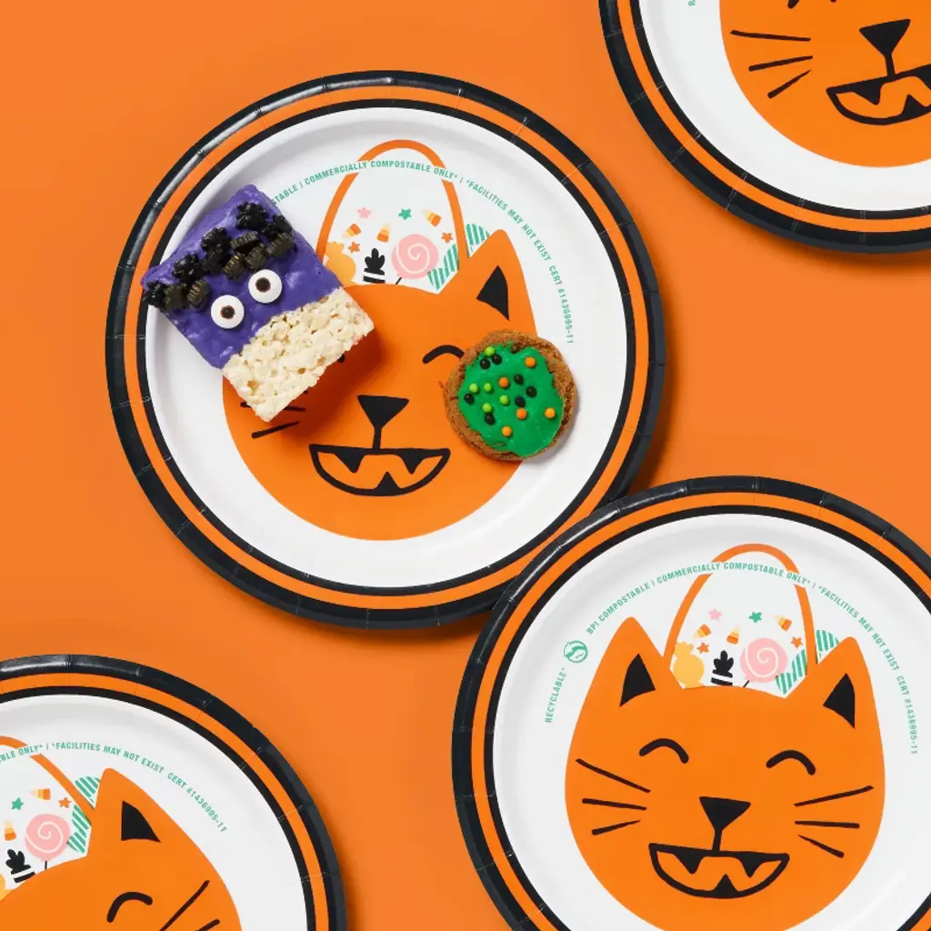 Add Halloween flair to your parties or dinners with the help of these 60-Count Heavy-Duty Paper Plates from up&up™. These round snack plates are made from heavy-duty grease- and cut-resistant paper for mess-free dining, while the slightly-raised edges make scooping food easy. This pack includes 44 paper plates, each featuring an orange cat graphic. Safe for reheating food in the microwave, you can simply toss them in the trash afterwards for easy post-party cleanup.up&up™: We believe making smart choices for the people, places, and pets in your life should be easy and affordable. And, having quality you can trust should be a given. That’s why you can count on our promise – caring for your everyday in every way.Satisfaction guaranteed – Love it or your money back.