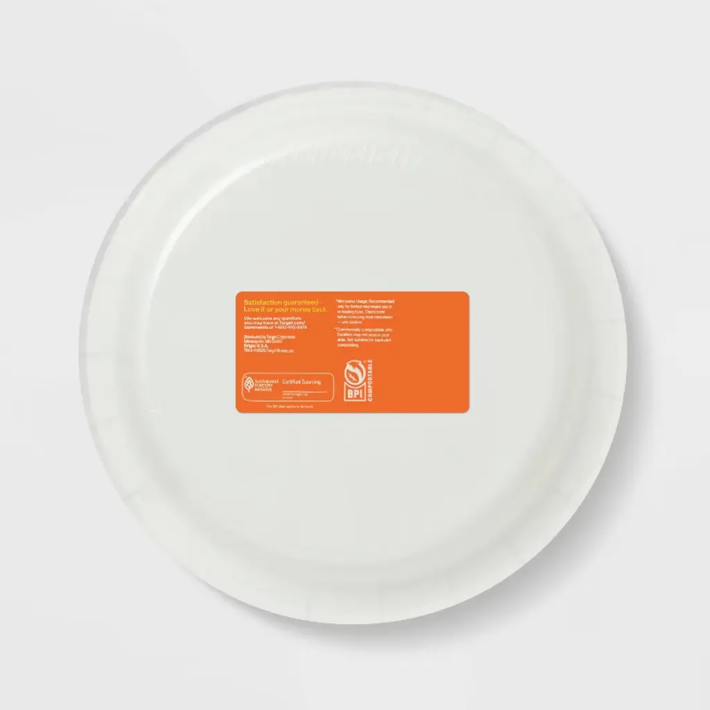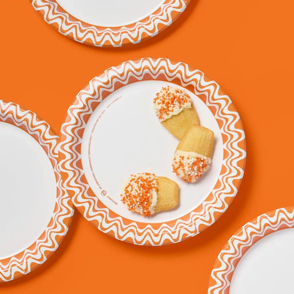Host Halloween parties with seasonal flair with the help of these 24-Count Heavy-Duty Paper Plates from up&up™. These round snack plates are made from heavy-duty grease- and cut-resistant paper for mess-free dining, while the slightly-raised edges make scooping food easy. This pack includes 44 paper plates, each featuring a white and orange spiral design on the rim and a white background. Safe for reheating food in the microwave, you can toss them in the trash after meals for easy cleanup.up&up™: We believe making smart choices for the people, places, and pets in your life should be easy and affordable. And, having quality you can trust should be a given. That’s why you can count on our promise – caring for your everyday in every way.Satisfaction guaranteed – Love it or your money back.