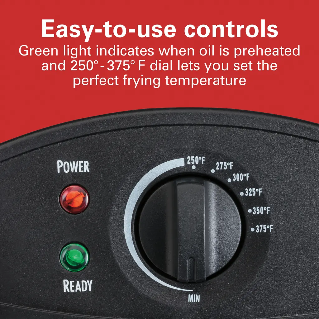 With the Hamilton Beach® 12 Cup Deep Fryer, you can fry up to 8 cups of restaurant-quality chicken, fries or onion rings in the comfort of your own home. You'll find it easy to use, even if you've never attempted to deep-fry food before. Simply preheat the oil until the green ready light comes on, fill the basket with food without overcrowding it, lower the basket into the oil and cover with the lid. When food is finished frying, hook the basket over the oil tank to easily remove excess oil from your food. For easy cleaning, the enamel-coated oil tank, cooking basket and lid are dishwasher safe. For added convenience when you're frying, the magnetic cord easily detaches from the deep fryer to prevent tipping.