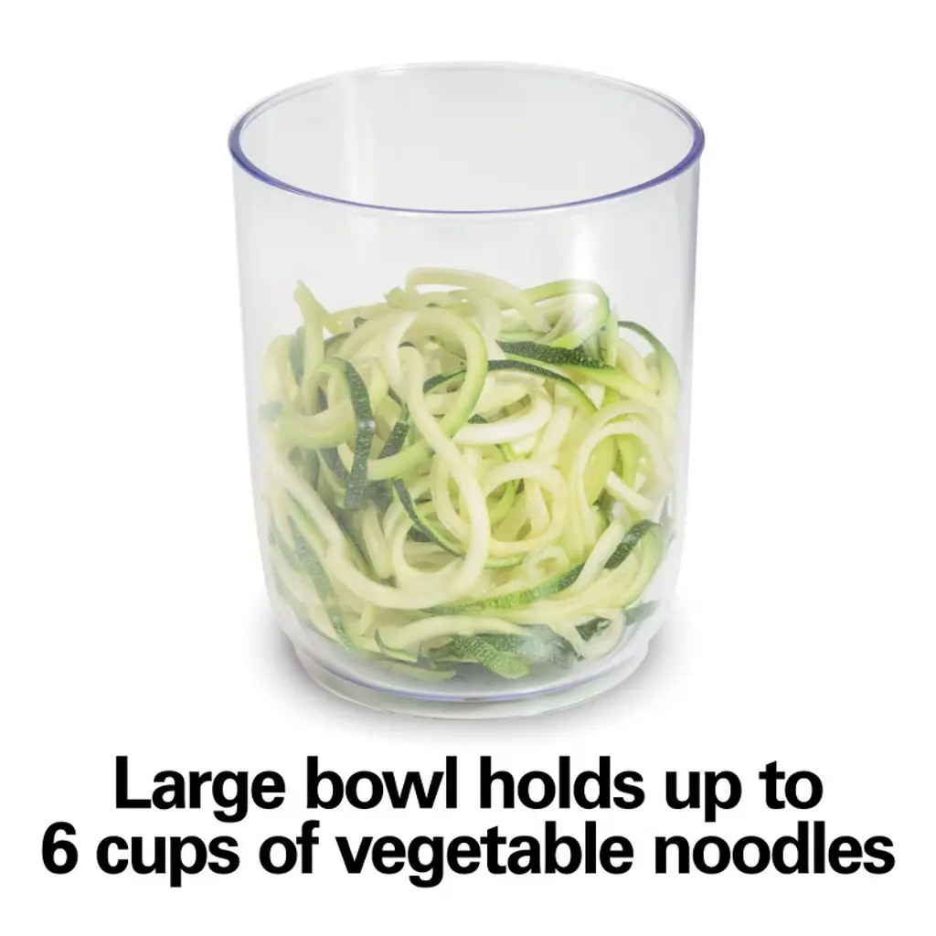 The Hamilton Beach® 3-in-1 Electric Spiralizer is perfect for anyone who wants to eat healthy or stick to a low-carb diet. It lets you quickly and easily create healthy vegetable spirals and ribbons to use in your favorite pasta dishes, salads, and other recipes. The spiralizer has 3 cutting cones to transform whole fruits and vegetables into spaghetti, linguine or ribbon-shaped noodles for fun, delicious meals. It's great for zucchini noodles or "zoodles," vegetable salad, curly fries, apple tarts and more. The spiralizer bowl holds 6 cups of vegetable noodles and is just the right size for making family meals or processing vegetables for recipes. The large 2.5" round chute fits whole foods like zucchini, squash and cucumbers, eliminating prep work to save you time and effort in the kitchen. The metal food grip on the food pusher securely holds foods to make beautiful spirals. Simply switch the motor on and gently push food through while the spiralizer does the work for you. The electric spiralizer is easy to clean with dishwasher safe parts and includes a cleaning brush. All parts store together neatly and compactly.