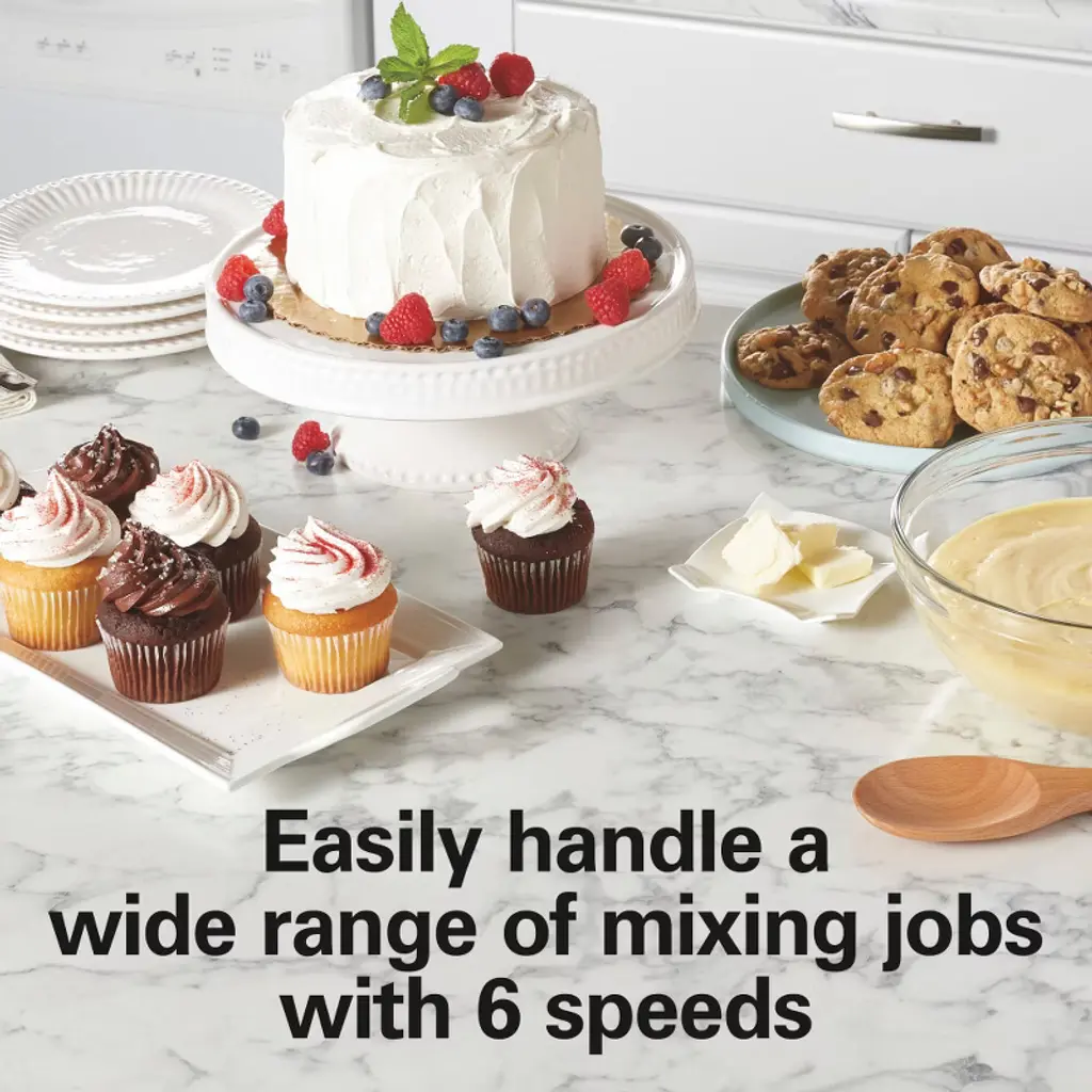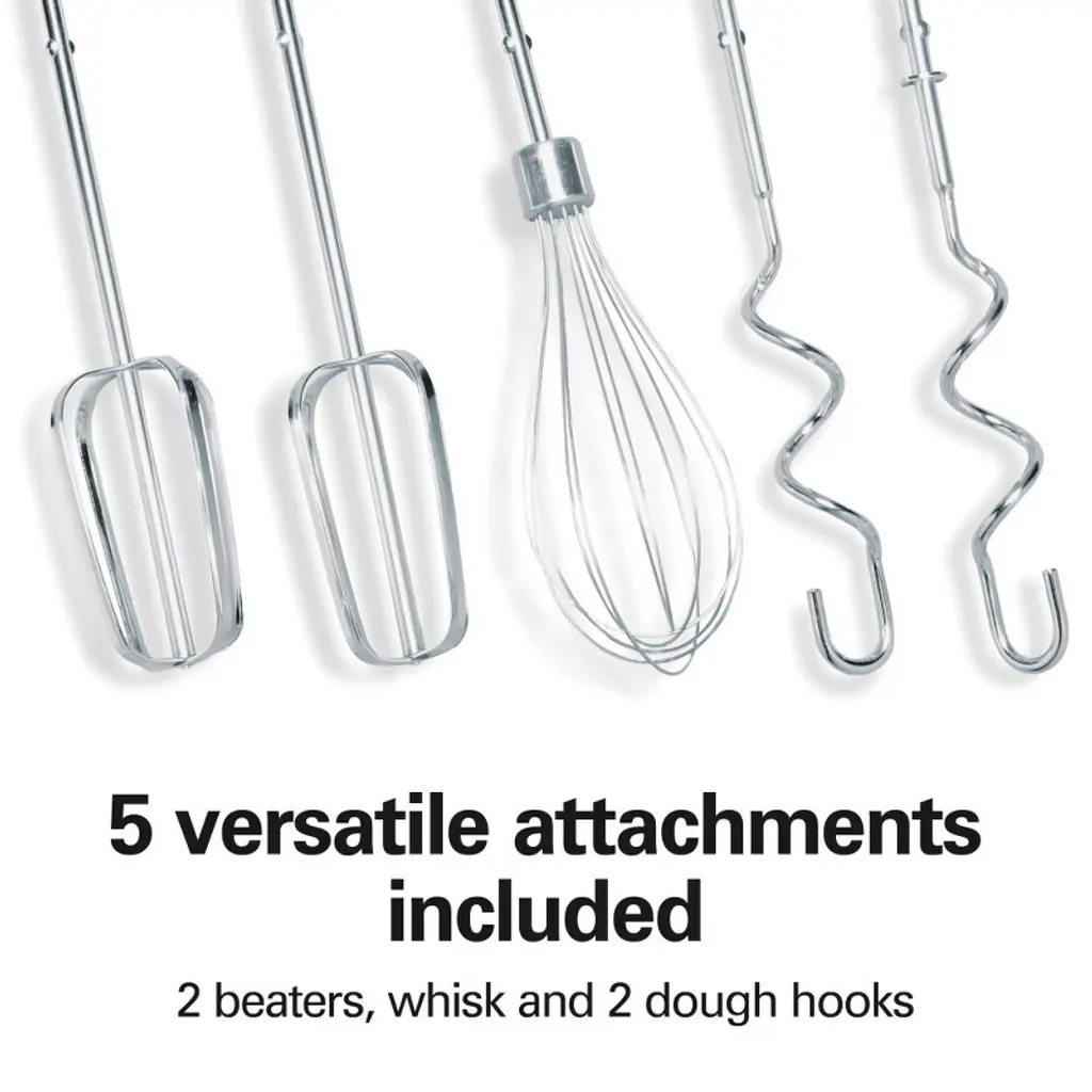 With the Hamilton Beach® Stainless & Black 6 Speed Stand Mixer, you get two products in one space-saving appliance. Mixing a batch of bread or cookie dough? Let the stand mixer do the work. Whipping up a quick dressing? Unlock the hand mixer from the base for the fast results you want. The Hamilton Beach Stainless & Black 6 Speed Stand Mixer has a powerful 290 watt peak power motor for all your mixing needs. As you mix, the Shift & Stir™ bowl rotating lever lets you rotate the bowl from side to side for thorough mixing. The 2 traditional beaters, a whisk and 2 dough hooks take you from mixing cake batter and cookie dough to whipping cream and kneading pizza dough. You can easily handle a wide range of mixing jobs with 6 speeds, and the QuickBurst™ button provides an extra burst of power at any speed. The durable 4 quart (3.8 L) stainless steel bowl easily accommodates most recipes and is dishwasher for easy cleanup. After mixing, the beater eject makes it easy to remove the attachments, which are also dishwasher safe.