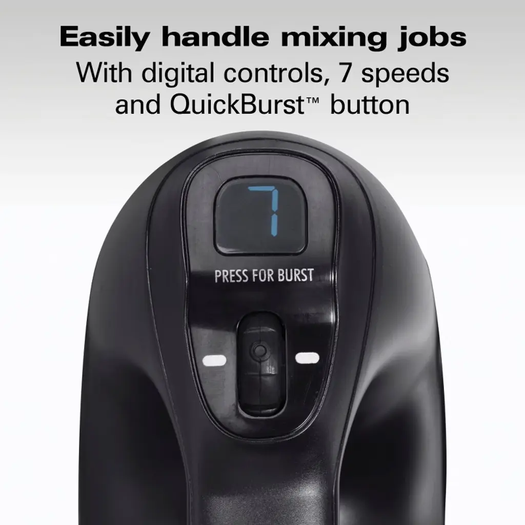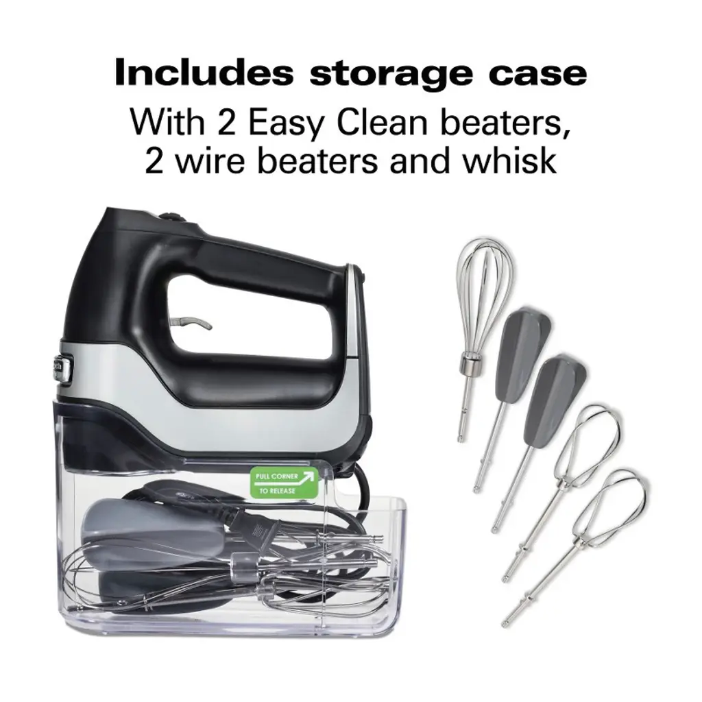 If you're a serious baker looking for the perfect mixing tool for all your recipes, look no further. With the Hamilton Beach® Professional 7 Speed Hand Mixer with Easy Clean beaters, you'll effortlessly mix ingredients for your recipes. The innovative Easy Clean beaters won’t clog and provide great mixing performance. You'll enjoy ultimate mixing power and control because the professional-grade DC motor powers through the thickest dough and maintains constant speed no matter what you're mixing. When mixing on the lowest speed, you'll have more control with Slow Start™ technology, which reduces messy splatters with starting speed that's nearly half as slow as traditional mixers. The Hamilton Beach Professional 7 Speed Hand Mixer comes with a storage case, 2 Easy Clean beaters, 2 stainless steel wire beaters and a whisk to cover every mixing task. The QuickBurst™ function provides an extra burst of power at every speed and the lockable swivel cord stays out of your way and adjusts for left- and right-handed users. After mixing, the quick-release trigger makes it easy to remove the attachments, which are dishwasher safe for easy cleanup. The attractive black color with chrome bands looks great in any kitchen. Includes 5 year limited warranty.