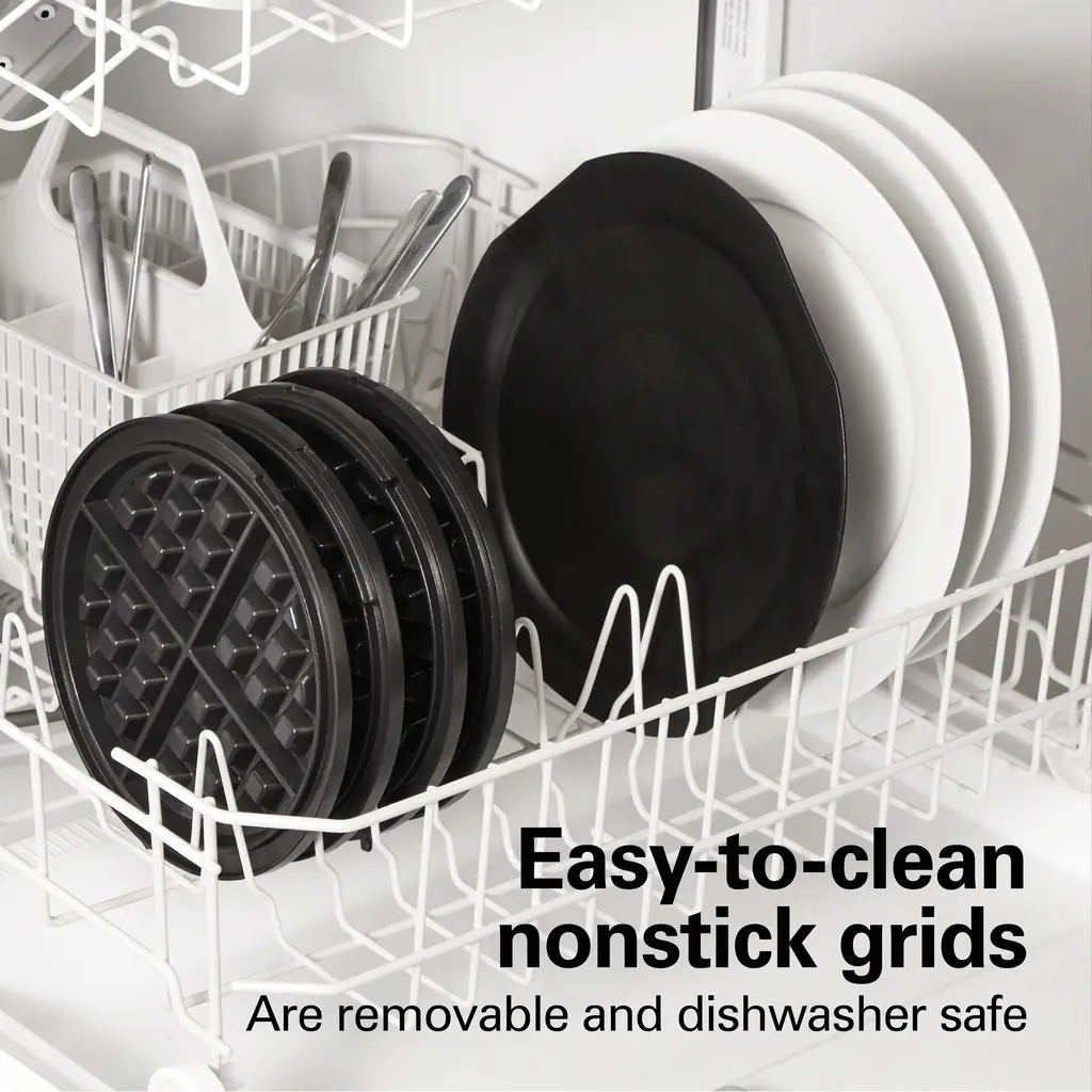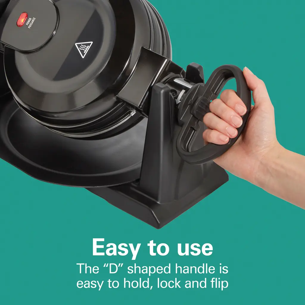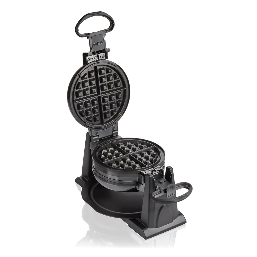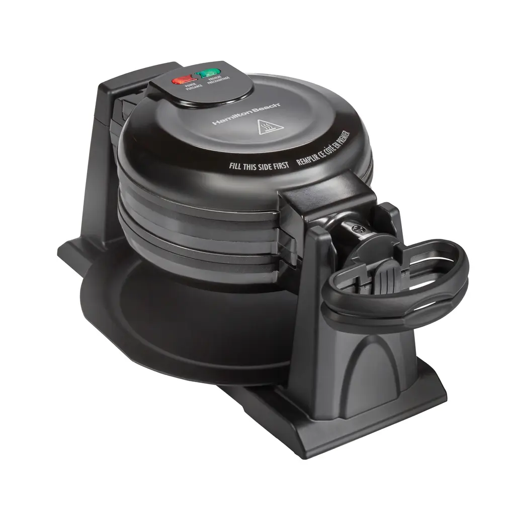 The Hamilton Beach® Double Rotating Belgian Waffle Maker is the perfect appliance for families on the go. With the ability to cook two Belgian waffles simultaneously, you can quickly serve up a delicious breakfast for everyone. The flipping action ensures even cooking and a crispy outside with a soft and fluffy inside, similar to restaurant-quality waffles. The waffle maker's indicator lights make it easy to tell when it's ready to cook, and the handle is lockable and easy to hold. The removable nonstick plates and drip tray make cleaning a breeze, whether by hand or in the dishwasher.Features: