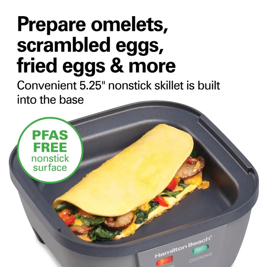 With the Hamilton Beach® Egg Bites Plus in your kitchen, you can satisfy the breakfast tastes and preferences of your whole family all week long. This incredibly versatile egg cooker lets you make eggs 6 ways. Create up to 4 fluffy egg bites, 4 poached eggs or 9 soft, medium or hard-boiled eggs. Make delicious omelets, scrambled eggs, fried eggs and more in the built-in 5.25” PFAS-free nonstick coated skillet. Hamilton Beach Egg Bites Plus is easy to use. To cook egg bites, poached eggs or hard-boiled eggs, simply pour water into the skillet base and place either the egg bite/poaching tray or hard-boiled eggs tray filled with eggs on top. Want to make an omelet, scrambled eggs, fried eggs or brown sausage links or patties? Set aside the lid and trays to access the skillet and plug it in to quickly heat it up. Since the skillet has a PFAS-free nonstick coating, food won't stick and it easily wipes clean. For easy cleanup, the included accessories are dishwasher safe.