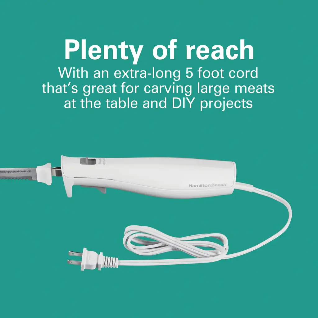 The Hamilton Beach® Electric Knife effortlessly carves ham, turkey, roasts and other meats. It's also great for slicing whole loaves of artisan and homemade bread. It's the perfect meat and turkey carving knife for the holidays and special occasions. This knife is also very popular with crafters because it easily cuts foam and other materials for DIY projects. The electric knife has a powerful 120 watt motor and reciprocating blades that are serrated and made of durable stainless steel, giving you precision control to cut quickly and evenly every time you slice. The lightweight knife has an ergonomic handle making it comfortable to hold while cutting. The extra-long 5 foot cord provides plenty of reach for carving large meats at the table and for cutting foam and other materials for DIY and craft projects. The knife is very easy to use. Turn it on by simply sliding the trigger, and release the trigger to stop the knife. The compact storage case keeps the knife, blades and carving fork neatly stored together in one place.