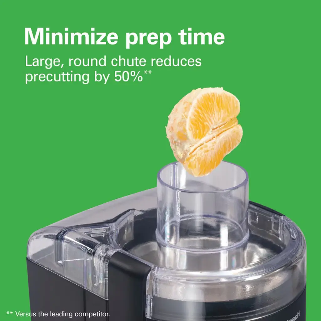 Flavorful, nutritious juice is just minutes away with the HealthSmart® Compact Juice Extractor. It makes fresh, healthy juice in seconds and the large chute reduces precutting by 50%** to minimize prep time and effort. The compact design takes up minimal countertop space, yet it has all the power you need to juice the toughest ingredients. You can quickly and easily juice everything from carrots and apples to celery and leafy greens with its powerful 400 watt motor, which comes with a motor protection system to help extend motor life. As you juice, the durable stainless steel strainer strains away pulp and seeds for smooth results. When you're finished juicing, all the removable parts go in the dishwasher for easy cleanup. BPA-free in food zones. Backed with a 3 year limited warranty by Hamilton Beach, the #1 brand in juice extractors.*