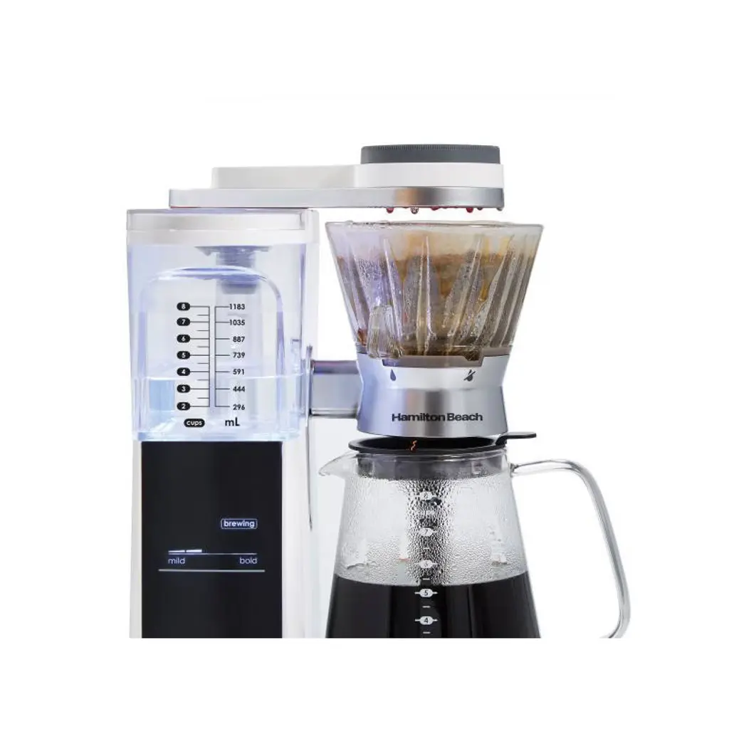 You'll enjoy custom-crafted, barista-quality pour-over coffee brewed precisely the way you like it when you brew with the Hamilton Beach® Convenient Craft™ Automatic or Manual Pour-Over Coffee Brewer. It gives you 2 ways to brew rich, flavorful pour-over coffee at home. You control the bloom cycle, temperature, and brew strength for rich, delicious pour-over coffee brewed to your exact specifications. Use the machine's automated process when it's convenient, or brew manually when you have more time or want more control. The display guides you through each step of the brewing process, giving you the confidence to make perfect pour-over coffee, even if you're just learning. It shows you how much water and coffee to add based on the brew strength and number of cups you select. The integrated scale counts down as you add coffee grounds, to ensure you're adding the exact amount of coffee grounds for the precise coffee/water ratio every time. The oversized 12-hole showerhead evenly saturates coffee grounds at the ideal temperature, to extract the balanced, rich flavors of your coffee. Choose from 5 brew strength options and 2 heat settings, hot and extra hot. Incudes #4 cone filter samples and a water filter pack.