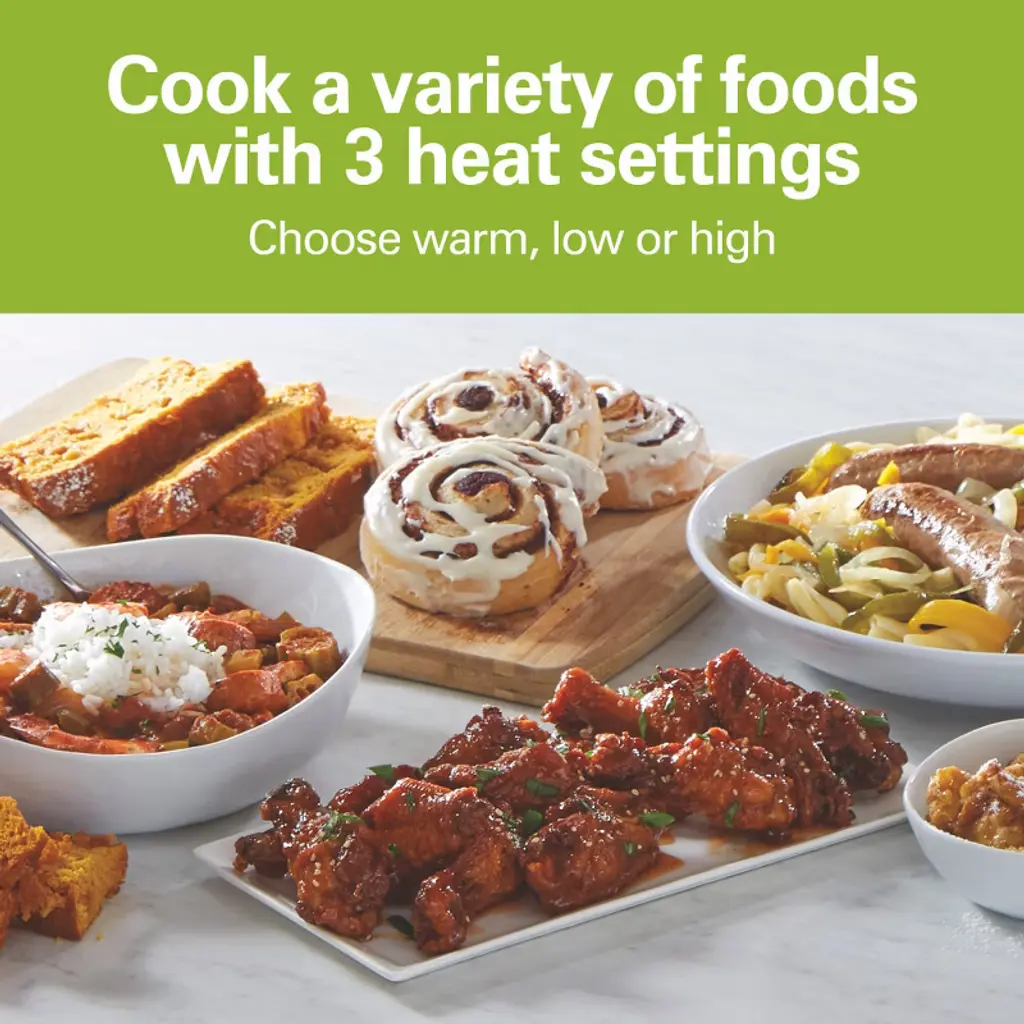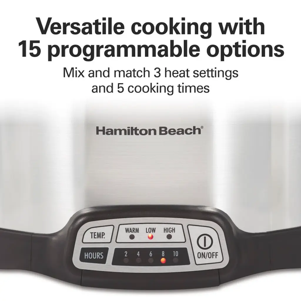 The Hamilton Beach® Programmable Slow Cooker is the versatile go-to slow cooker that lets you cook all your family's favorite meals without having to spend a lot of time in the kitchen. Mix and match warm, low or high heat settings with 5 cooking times — 2, 4, 6, 8 or 10 hours — for a total of 15 programmable cooking options. After cooking is complete, the slow cooker automatically switches to warm so you can set it and forget it. The large 4 quart size and oval shape make it ideal for cooking meat. The slow cooker will hold a 4 lb. chicken or a 2 lb. roast and serves 4+ people. It's the perfect size for family meals, potlucks and parties. The slow cooker makes delicious one-pot meals like lasagna, homemade chili, barbecue and macaroni and cheese. It's also great for cooking a variety of foods from meatball appetizers and vegetable side dishes to delicious desserts like peach cobbler and chocolate lava cake. The removable stoneware crock and glass lid are both dishwasher safe for easy cleanup.