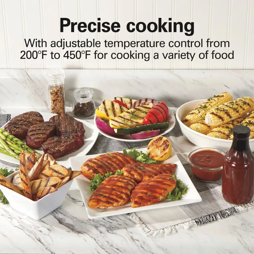 With the Hamilton Beach® Electric Indoor Searing Grill, there’s no need to fire up an outdoor grill to get great grilled flavor. The indoor grill features a high searing temperature of 450°F that locks in juices and flavor and makes everything you sear — steak, burgers, fish, chicken and pork chops — taste delicious. Best of all, food won't stick to the grill plate since it has a nonstick surface. The Hamilton Beach Electric Indoor Searing Grill is easy to use so you can grill with confidence. To sear food, simply plug it in and turn the temperature dial all the way up to sear. When the Hamilton Beach Electric Indoor Searing Grill reaches 450°F, the green indicator light will glow. When you want to use a lower grilling temperature or grill small pieces of food, the searing grill has adjustable temperature control and a special grilling section on the right for small portions. The removable grill plate has a PFAS-free nonstick surface. The grill plate, extra-large drip tray and removable cover all go in the dishwasher for easy cleanup.