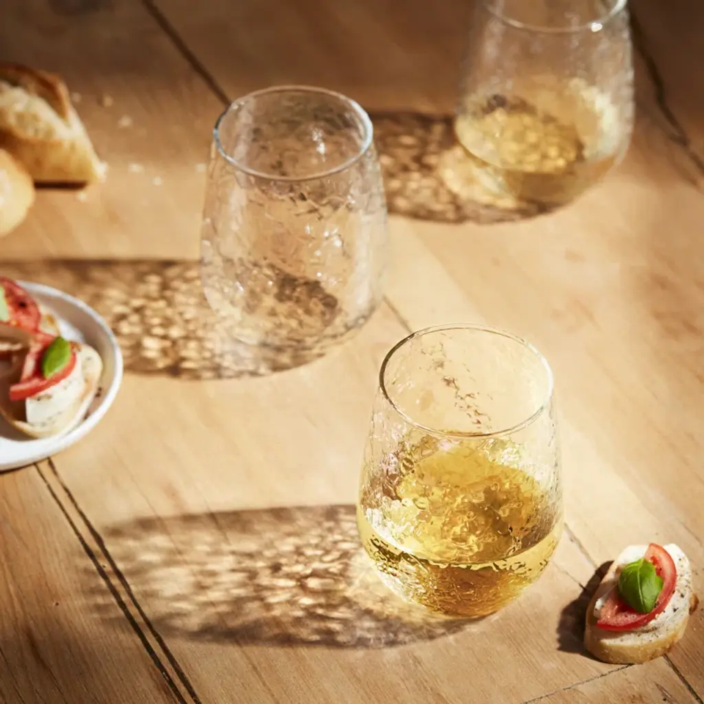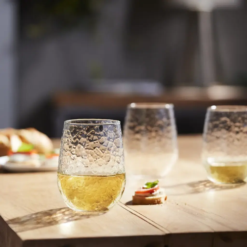 Libbey Hammered Stemless Wine Glasses Set: Enhance your dining experience with our 17-ounce hammered no stem wine glasses, a fusion of organic allure and timeless elegance. Our beverage glasses set of 8 reflect light beautifully, adding a touch of sophistication to any occasion. Designed for both formal gatherings and casual indulgence, this clear wine glasses set offers a comfortable grip with chiseled grooves that enhance tactile pleasure. With a simple silhouette that evokes rain on a windowpane, our cute wine glass set will be an elegant addition to your collection, whether you’re entertaining guests or indulging in a drink alone. Crafted from premium quality glass, this durable wine glasses set of eight ascertains longevity for everyday use. Whether you're savoring your favorite wine, bourbon, cocktail, or just water, these versatile wine glasses gift set accommodate every sip with grace. Our fun stemless wine glasses are dishwasher safe and offer effortless cleanup to preserve the charm of your drinkware for years to come. These Libbey stemless wine glasses exhibit convenience without compromising on style.