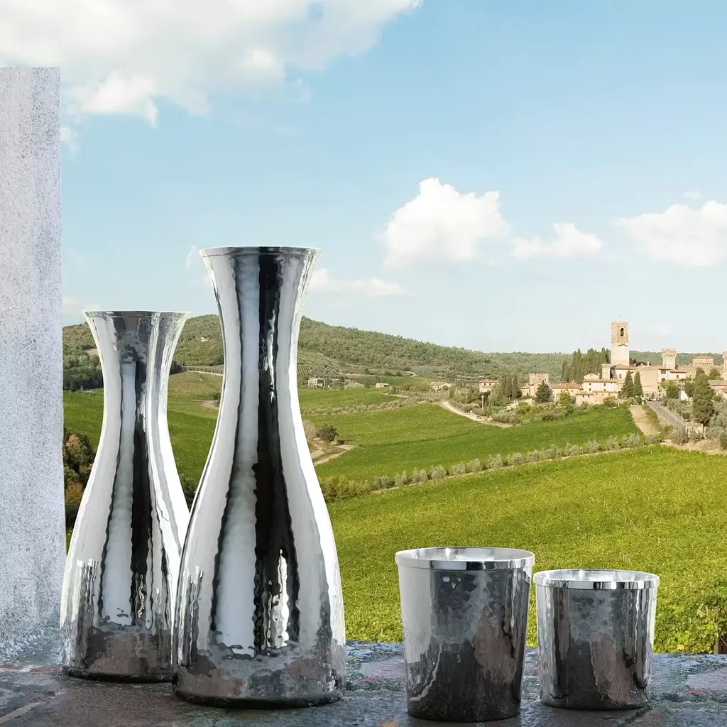 A wonderful addition to any modern or classic dining experience, the Silver Hammered Wine Glass is a fine example of extraordinary dining elegance with a simple design. Silver is a phenomenal material for crafting drinking glasses as it offers antibacterial and antibiotic properties while maintaining the fine quality and taste of the beverage inside.