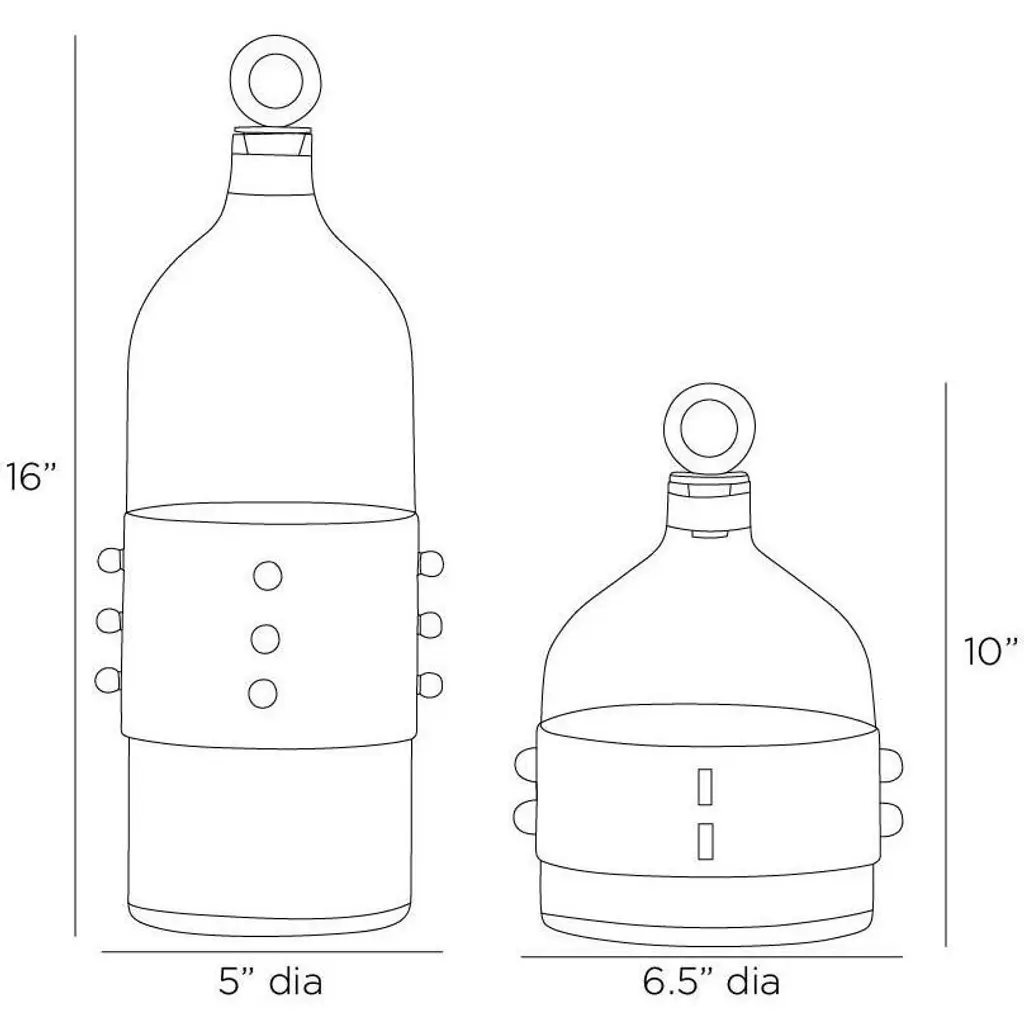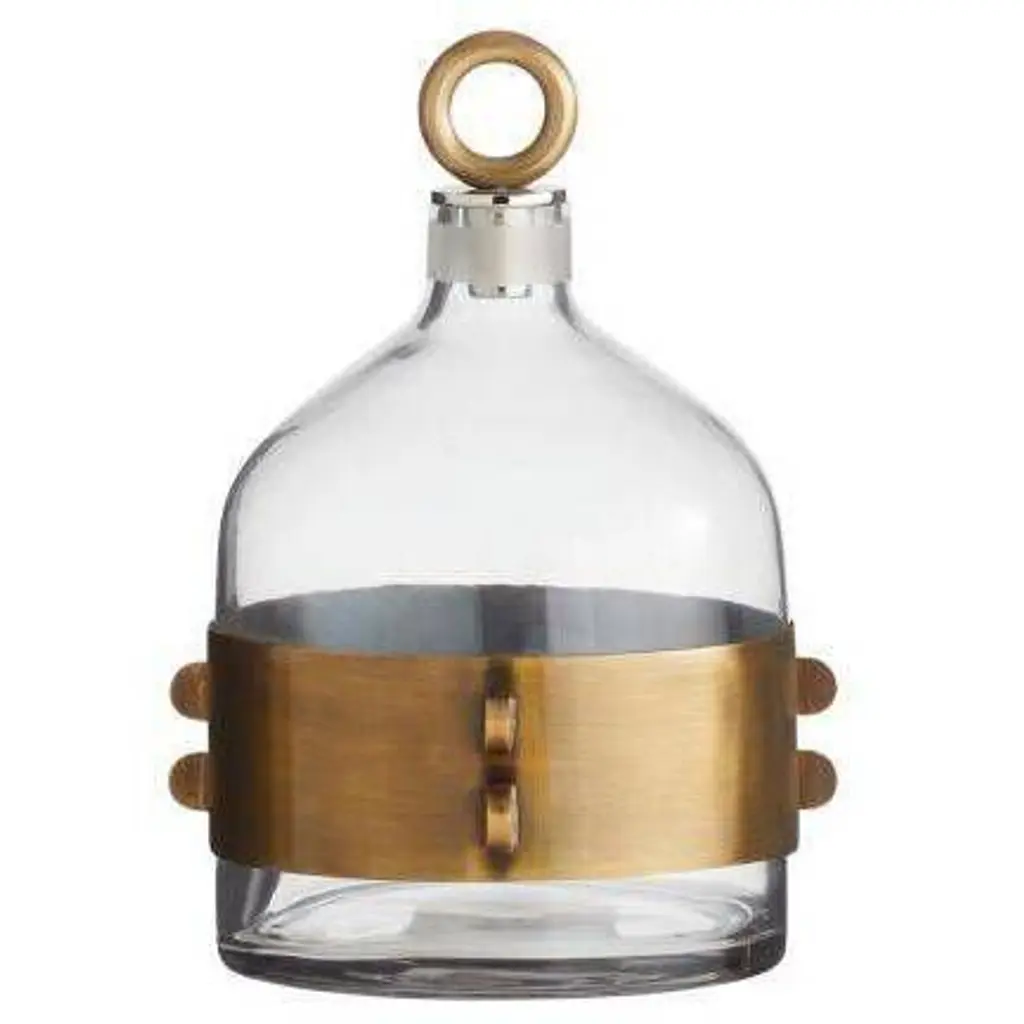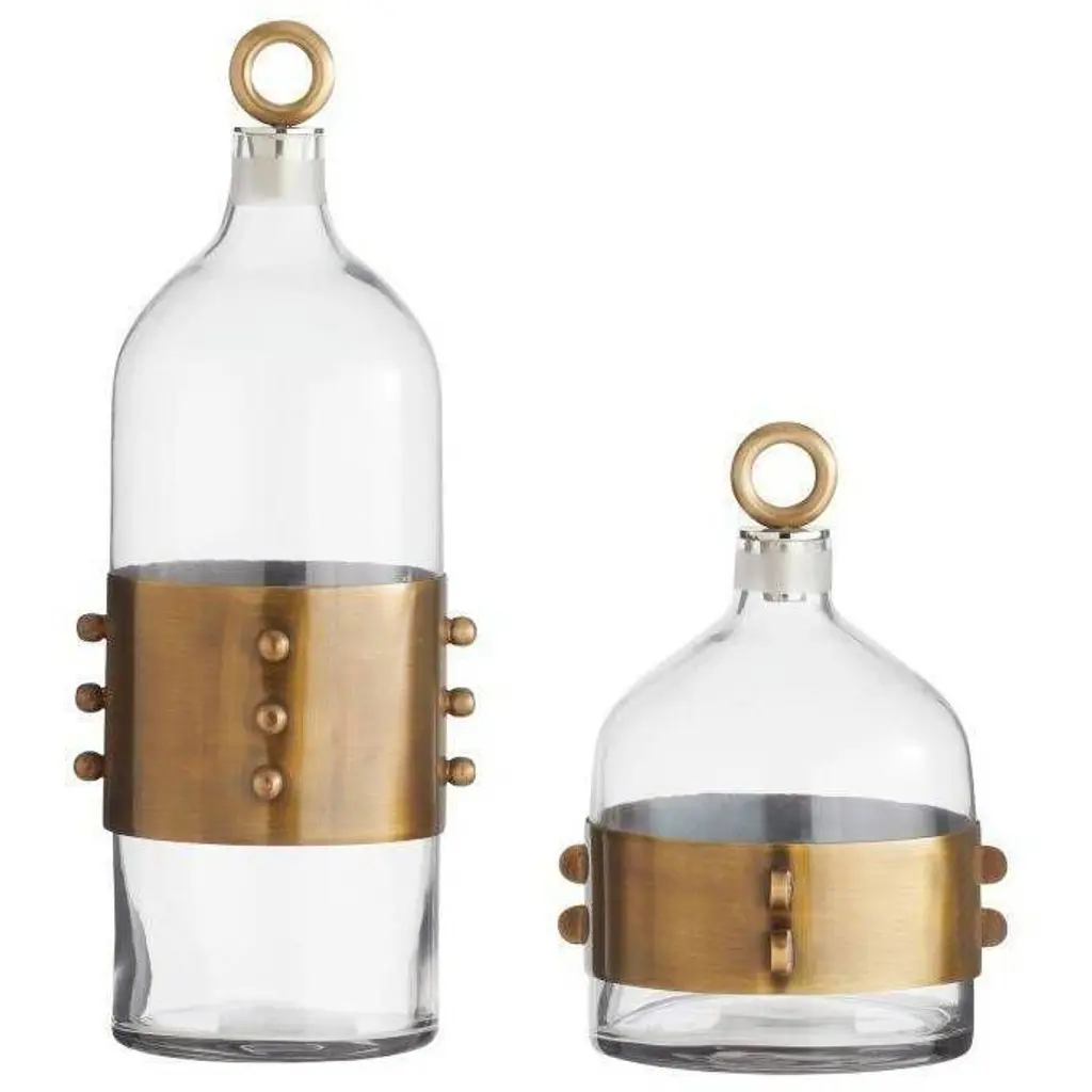 Over-scaled decanters of clear leaded glass are encircled with bold studded cuffs of antique brass. Topped with circular stoppers, this growler-shaped duo will lend an industrial edge to any bar.