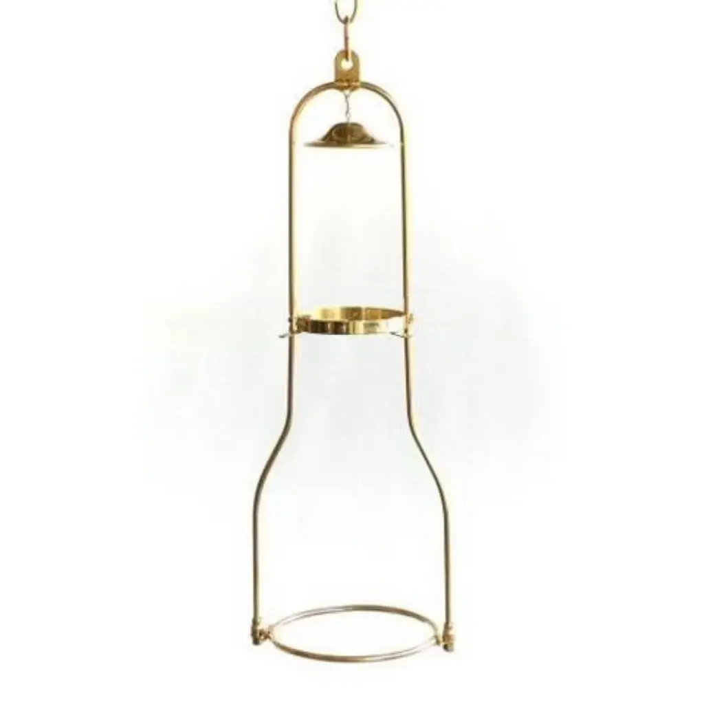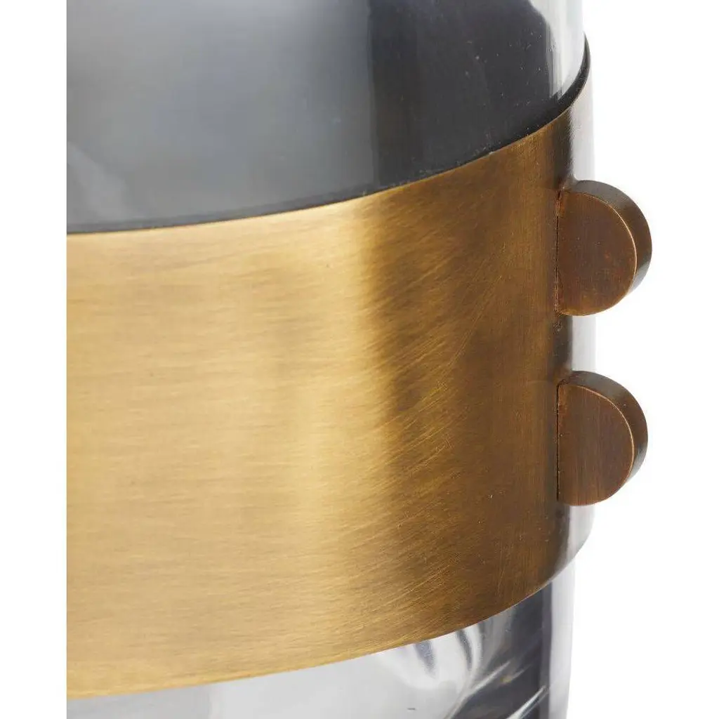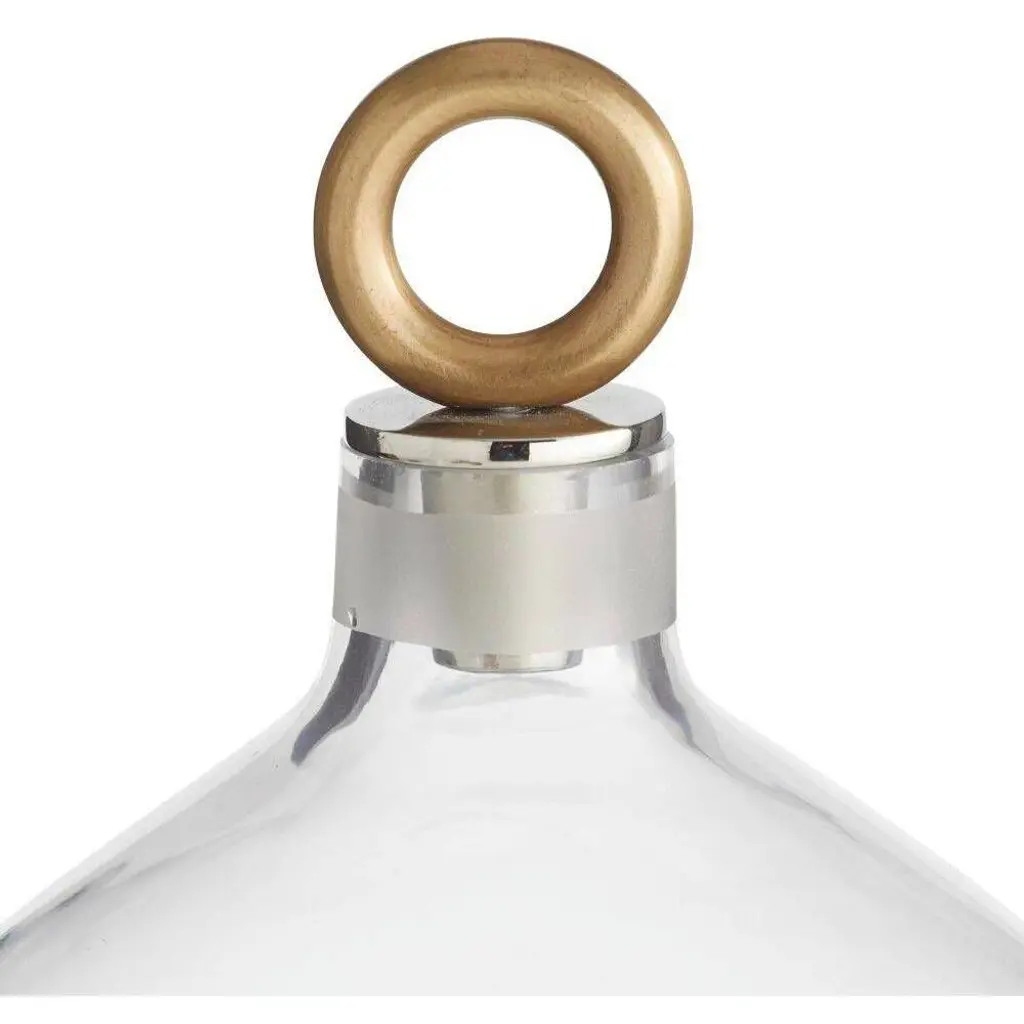 Over-scaled decanters of clear leaded glass are encircled with bold studded cuffs of antique brass. Topped with circular stoppers, this growler-shaped duo will lend an industrial edge to any bar.