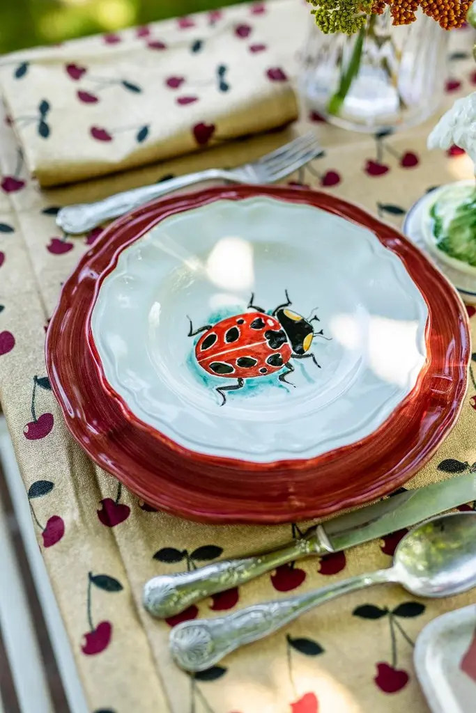 Step into the charm of an English garden with our ceramic plates, hand-painted with the design of a ladybird. Perfect as enchanting tableware to elevate your dining experience or as whimsical wall decor to bring a touch of nature-inspired beauty to your home. This plate combine elegance and artistry, capturing the magic of a summer garden in full bloom.100% CeramicMade in ItalyHand-PaintedSize: Ø 21cm