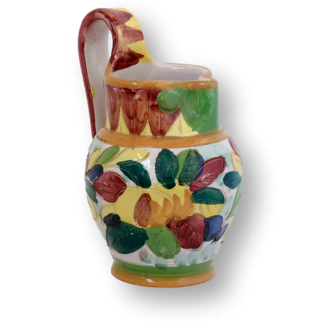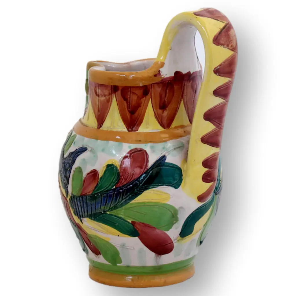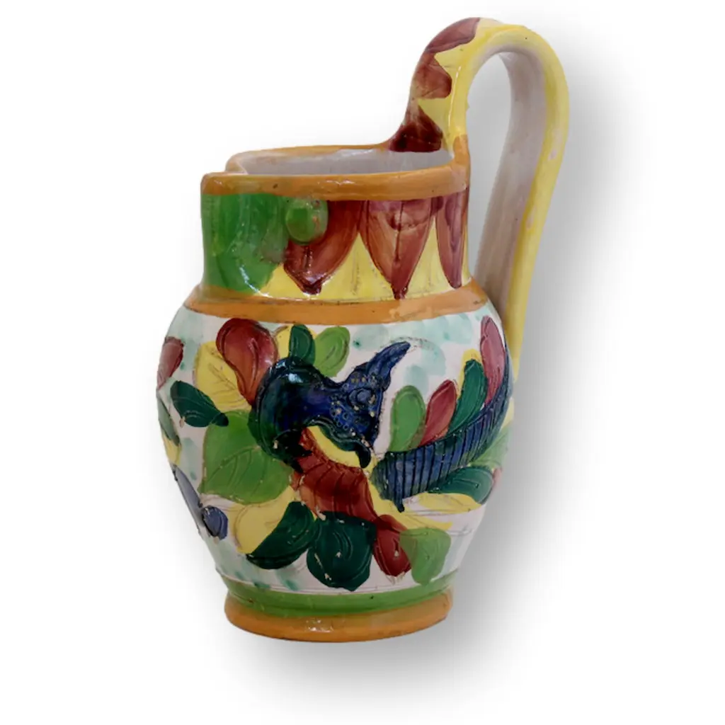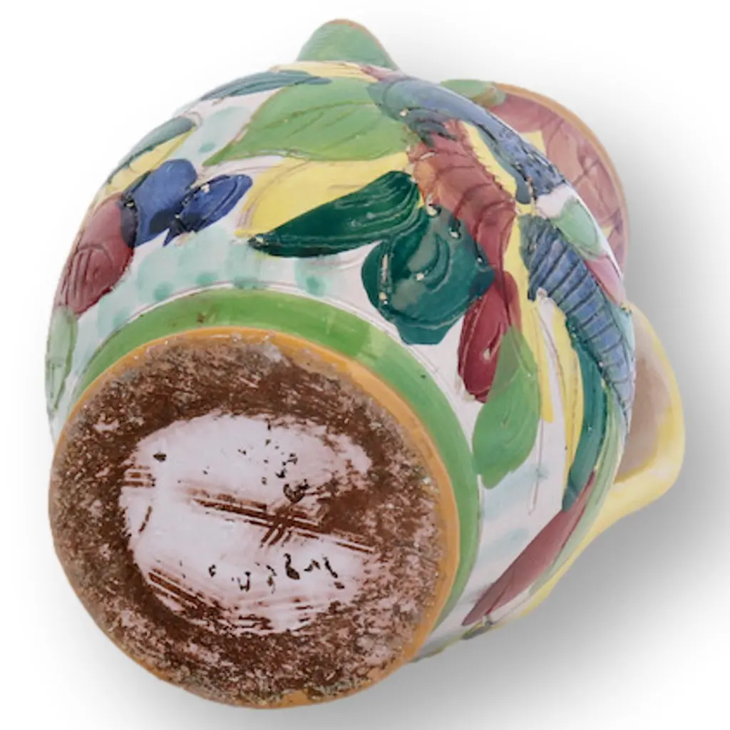 Heavy hand-painted ceramic pitcher. Terra Cotta clay with colorful, thick glaze. No maker's mark.