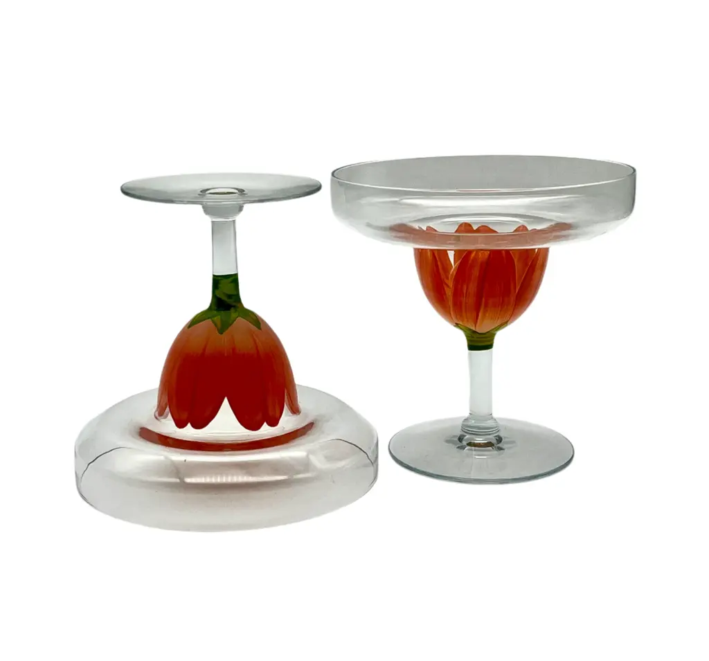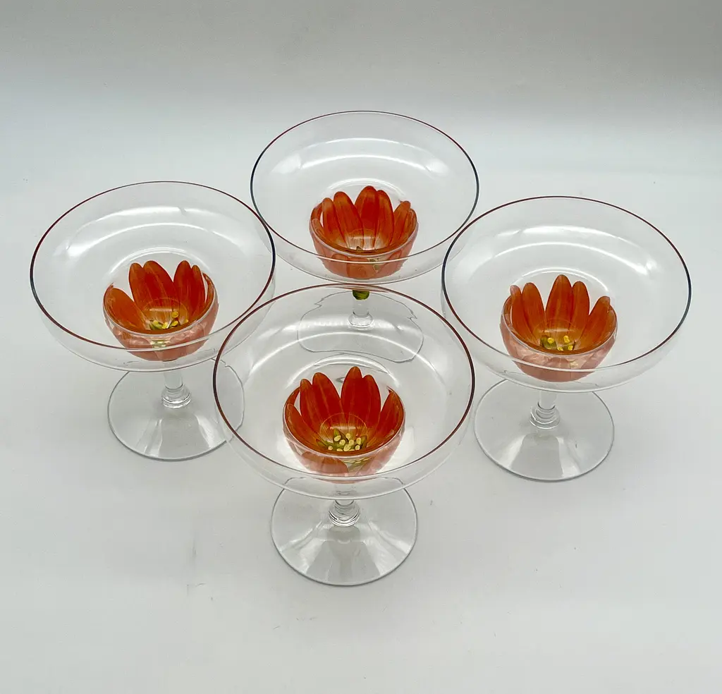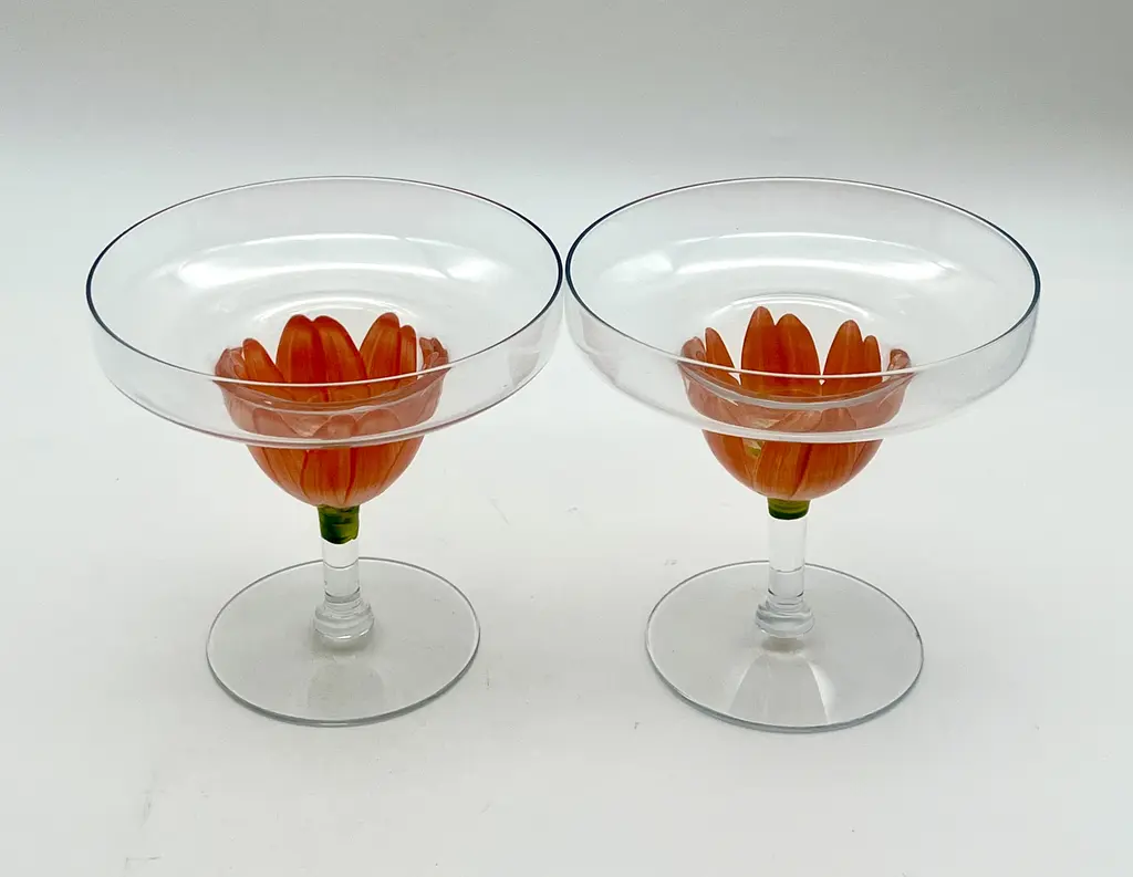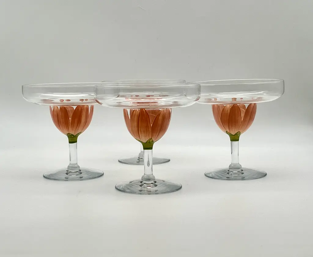 Pair of c. 1980s stemmed margarita glasses with hand-painted coral pink tulip bases. Two pairs available; price is per pair.