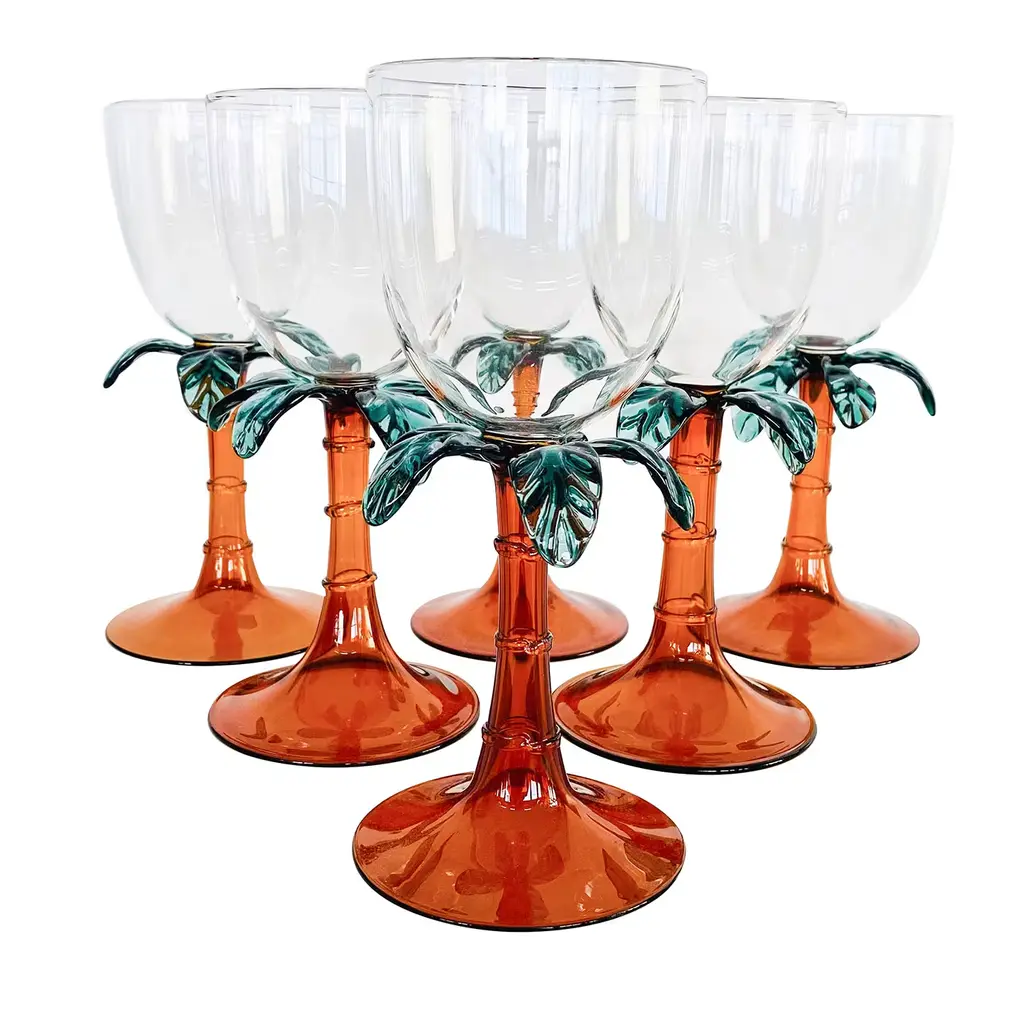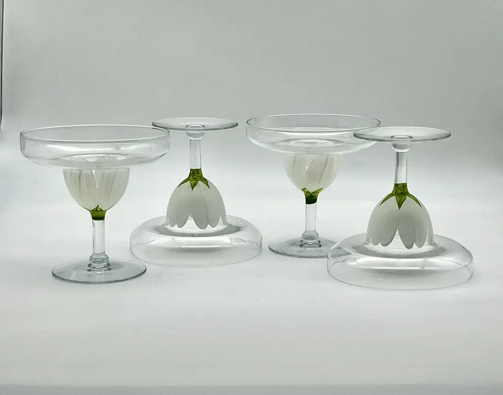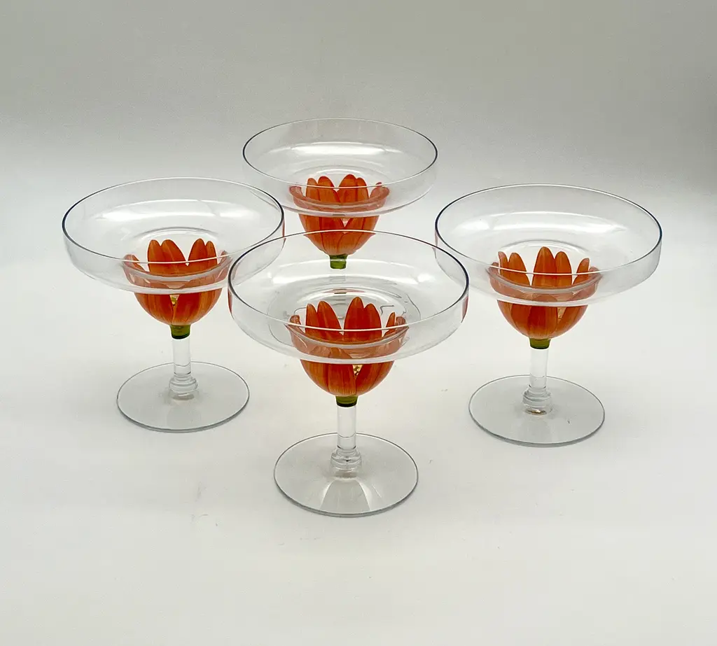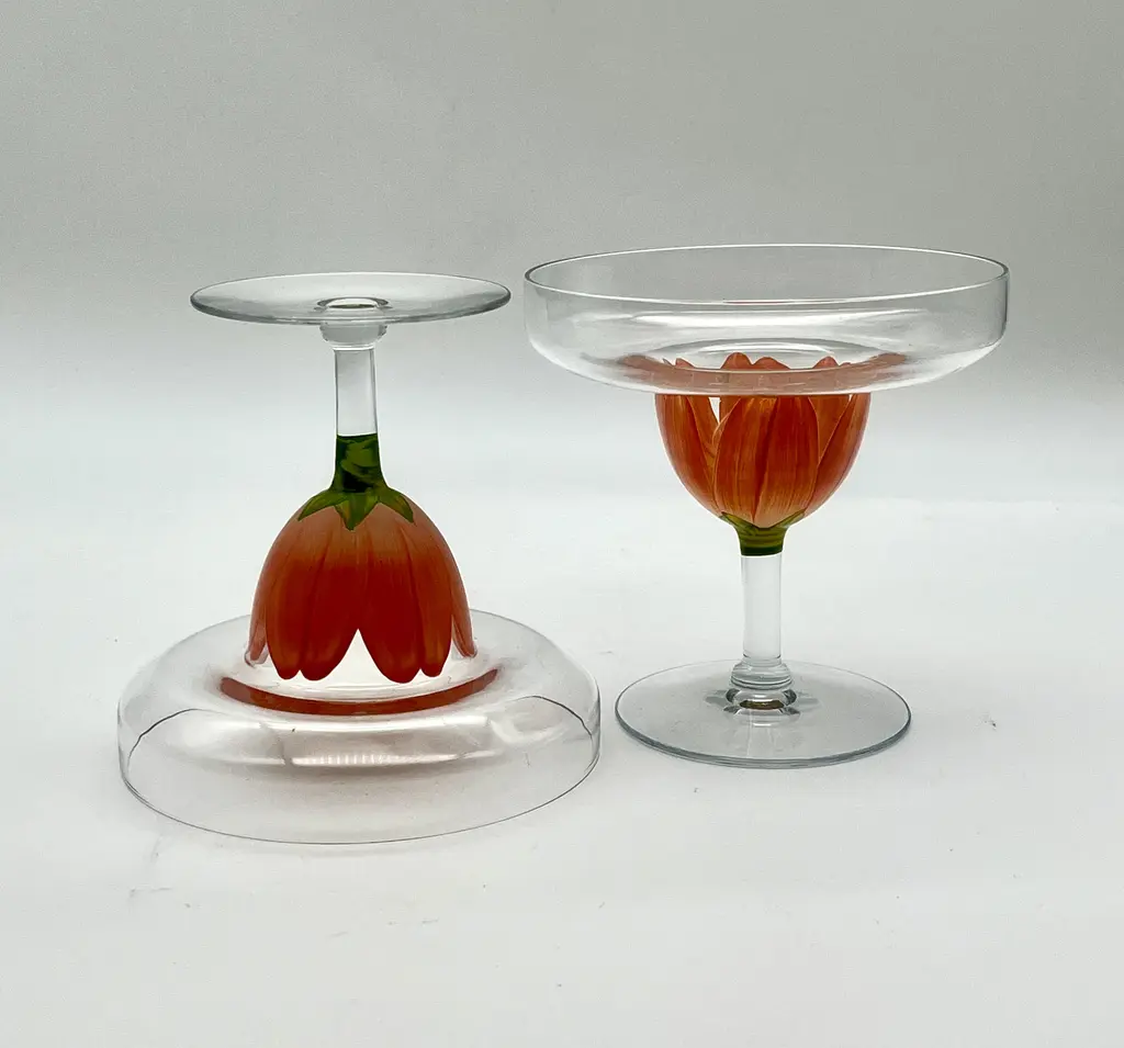 Pair of c. 1980s stemmed margarita glasses with hand-painted coral pink tulip bases. Two pairs available; price is per pair.