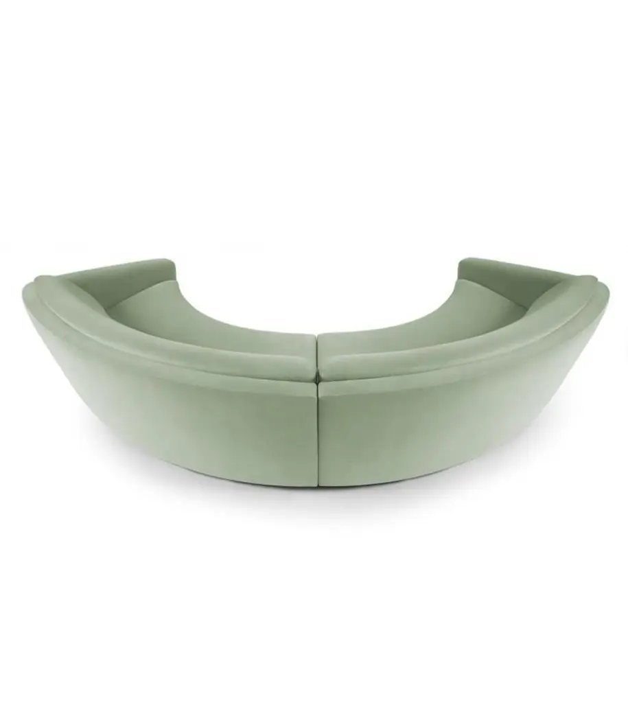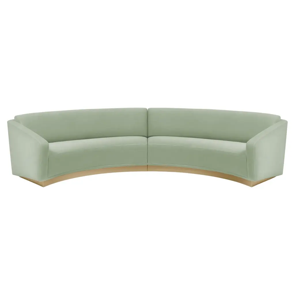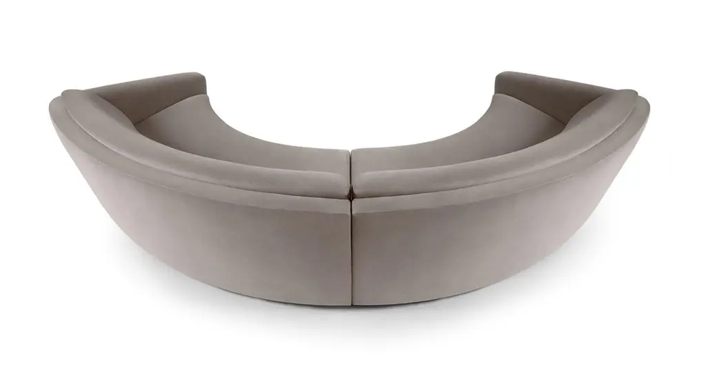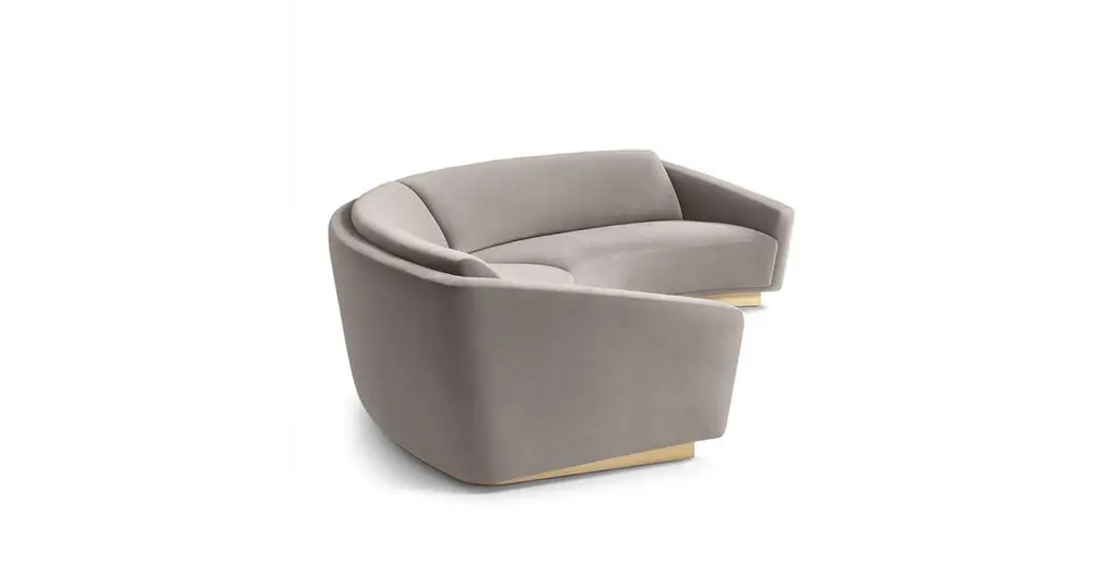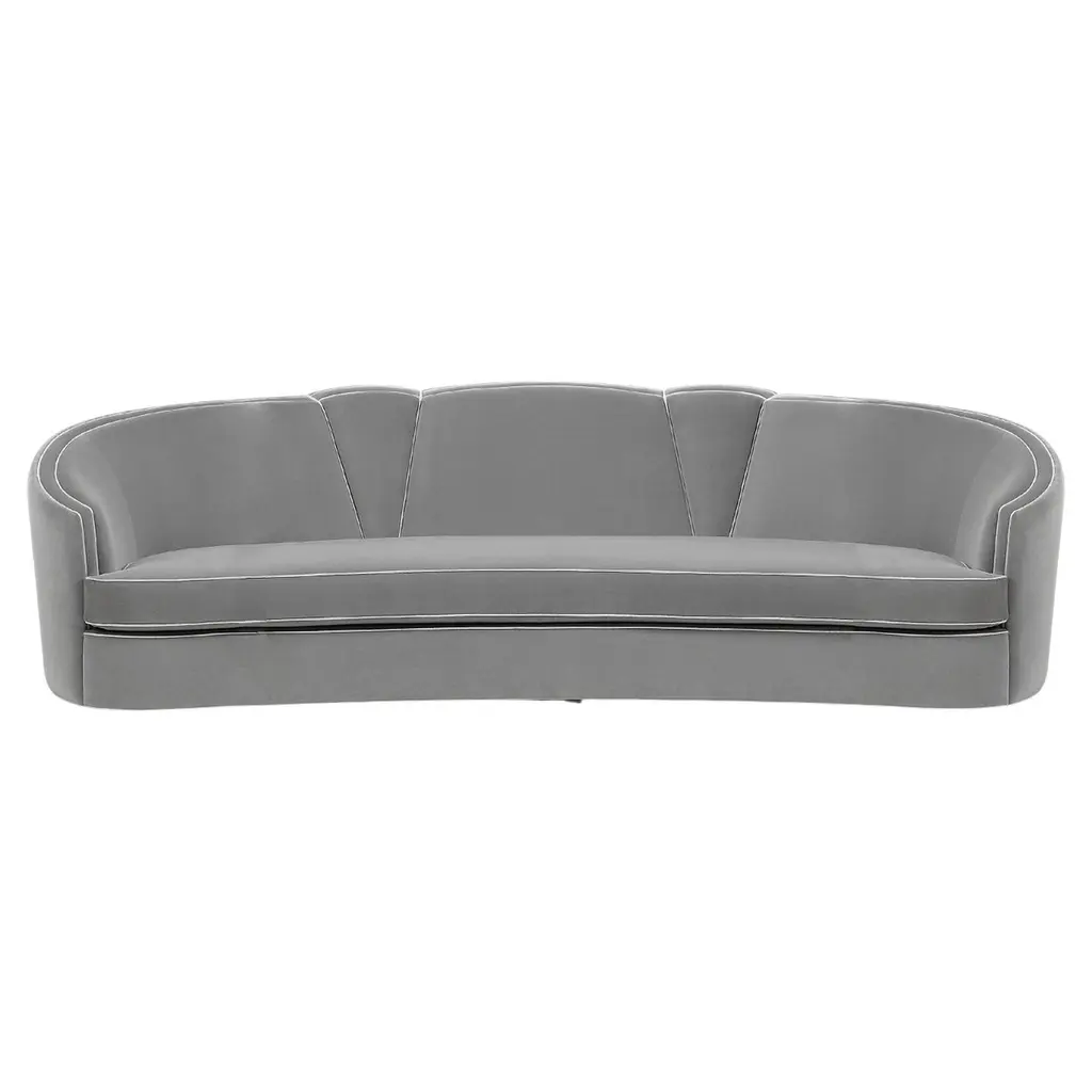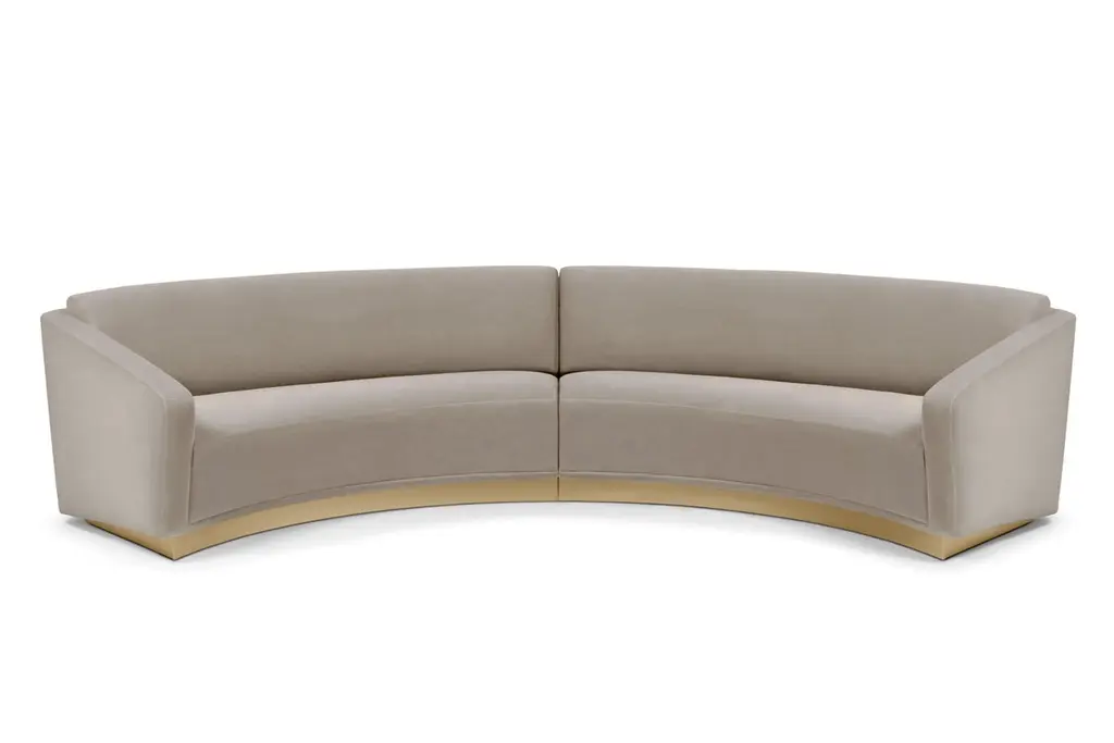 The handmade sofa is the representation of magnetism. Featuring tailored upholstery in light grey cotton velvet and a stylish brushed brass footer, it is masterfully crafted with an emphatic, yet elegant, curved contour. The sofa is a statement piece that exudes effortless charisma.Frame in solid wood.Foam in 100% PU with BS standard fire specifications.Foam in American Standard CAL 117 for the USA.Upholstery with upholster straps.Handmade in Europe.Dimensions:W 350 cm 137.8”D 185 cm 72.8”H 80 cm 31.5”SH 41 cm 16.1”AH 56 cm 22.1”.Contact us to enquire about COM/COL production, requirements and material shipping instructions.Please contact us if you have any questions about customization and pricing. We will be glad to check with the factory’s technical team if sizes, finishes, and colors can be customized. We do our best to expedite production and to ship and deliver product within the listed lead time, however current lead times might be longer due to global shipping backlog and delays. These delays are out of our control and cannot be a reason to cancel an order.Our pricing includes all costs for international shipping to the U.S., as well as duties and customs clearance fees. Please be aware that local delivery within the U.S. is not included. We offer white glove, front door, and warehouse delivery options. For shipments outside the U.S., kindly reach out to us for a detailed quote.